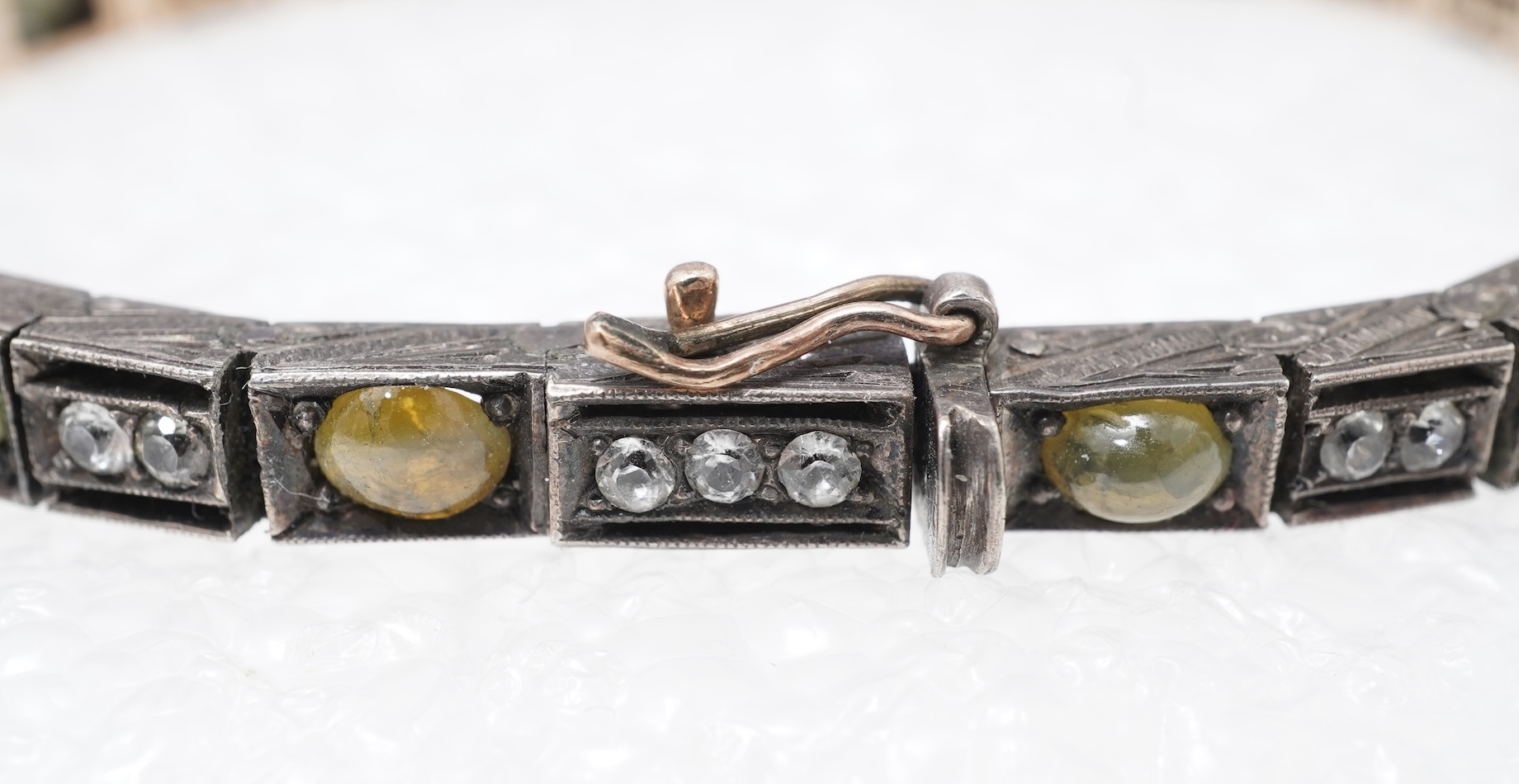 A cat's eye chrysoberyl and white sapphire bracelet, composed of rectangular links set with cabochon cat's eye chrysoberyls, spaced by pairs of colourless simulant diamonds, mounted in silver, length 18.5cm