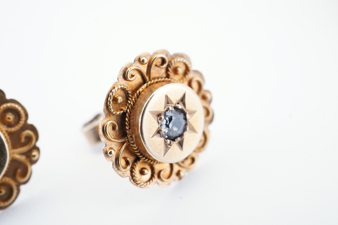 A Victorian gold and diamond demi-parure, late 19th century and later, comprising: a roundel brooch in the Etruscan revival style, centring on a cushion-diamond weighing approximately 0.15 carats in a star border, the reverse with a glazed compartment containing a lock of hair, mounted in gold, 2.9cm diameter, stamped 15ct, gross weight approximately 7.5 grams; together with a similar pair of stud earrings, set with cushion-shaped diamonds totalling approximately 0.15 carats, 1.2cm diameter each, later post fittings, combined gross weight approximately 1.5 grams