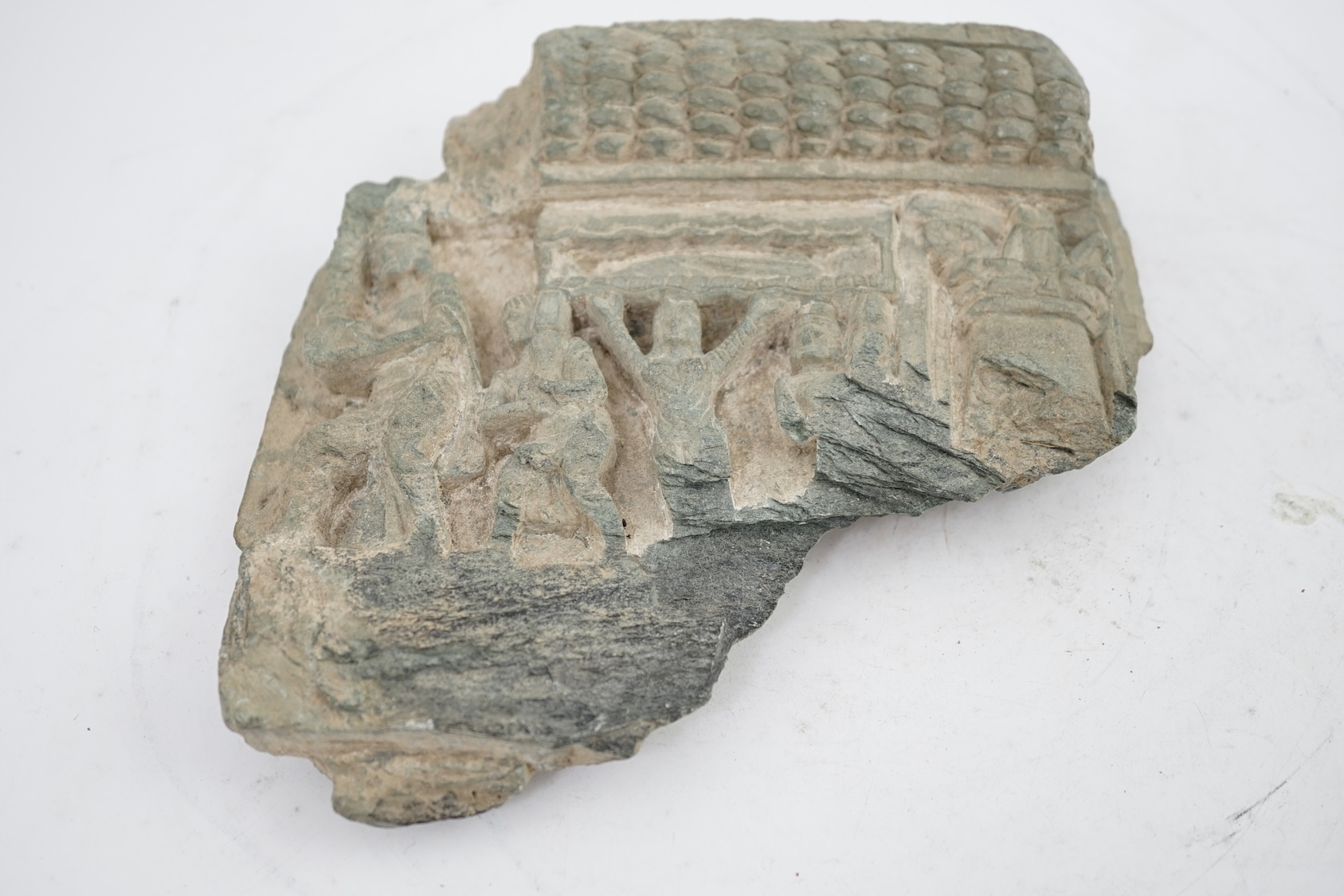 A Gandharan green schist relief fragment, probably 2nd/3rd century AD, 21cm wide, 20cm high