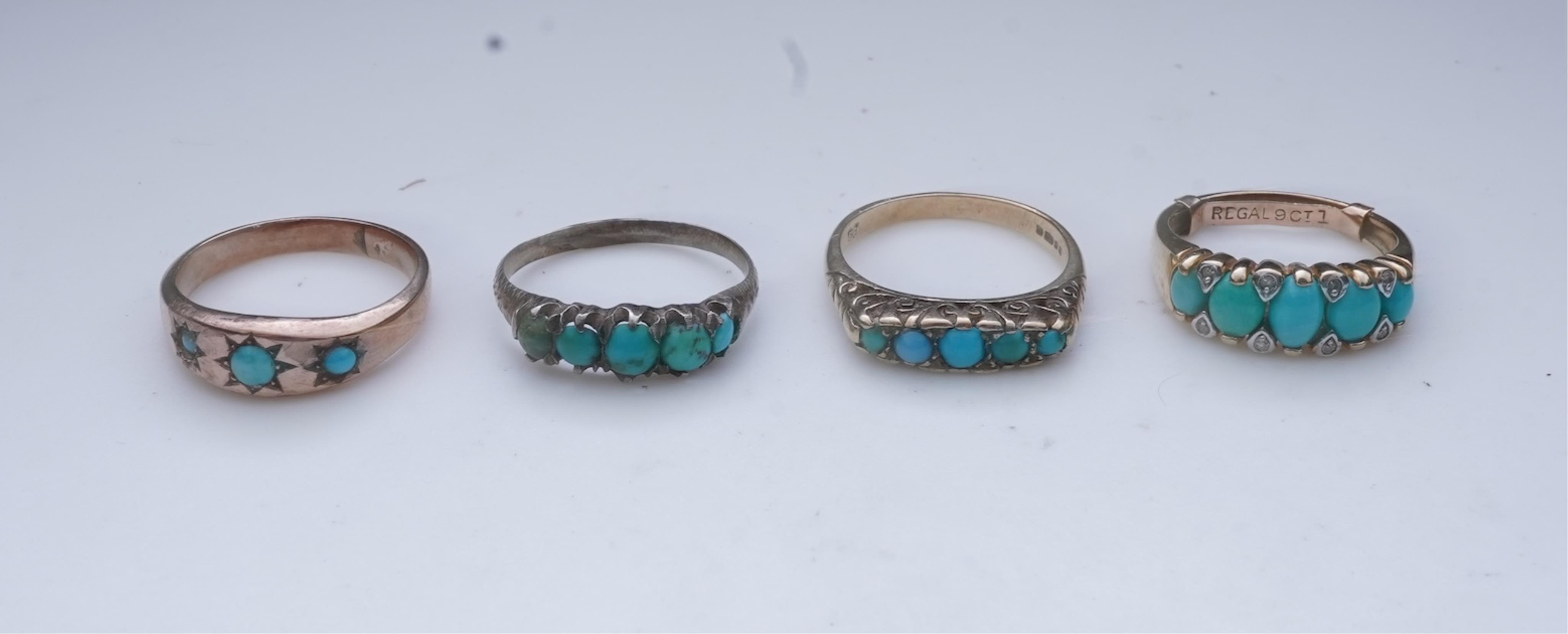 A group of four turquoise rings, each set with turquoise cabochons, one additionally accented with single-cut diamonds, three mounted in gold, combined gross weight 7 grams; one mounted in silver