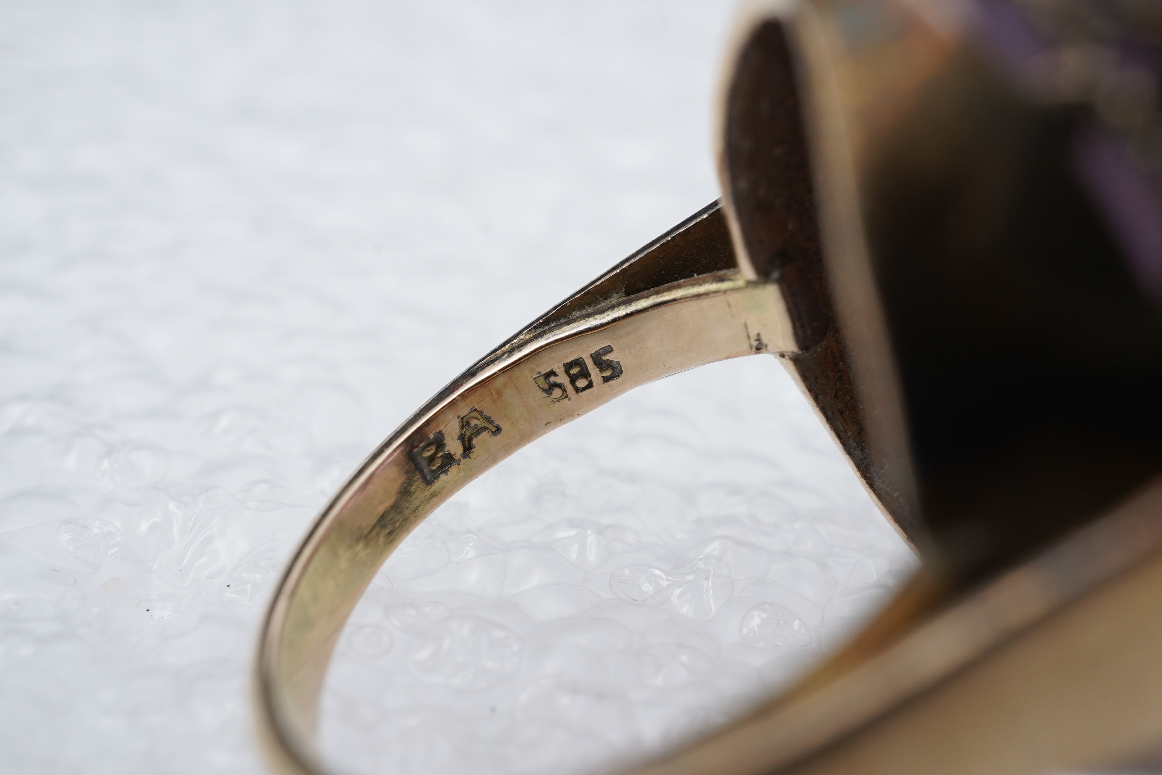 An amethyst ring, necklace and pendant, comprising: an oval amethyst set in a floral gilt silver necklace, length 32cm; an oval amethyst and seed pearl pendant, length 3.7cm; and a ring set with an oval amethyst, mounted in gold, size I, stamped 585, gross weight approximately 10 grams