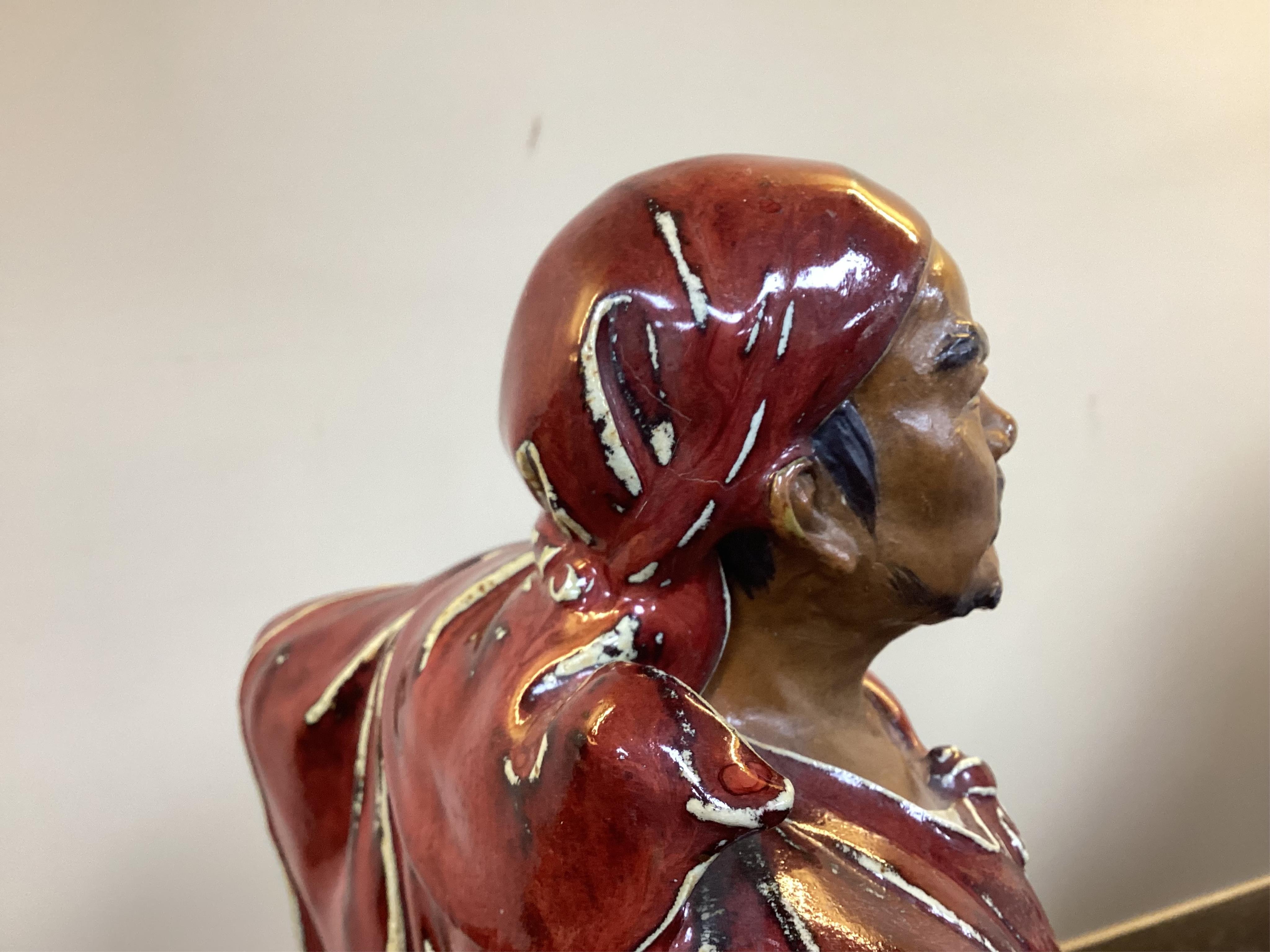 A large Chinese Shiwan stoneware figure of a warrior, 20th century, wearing a flambé glazed robe, 37.5cm high, small restoration to left-hand