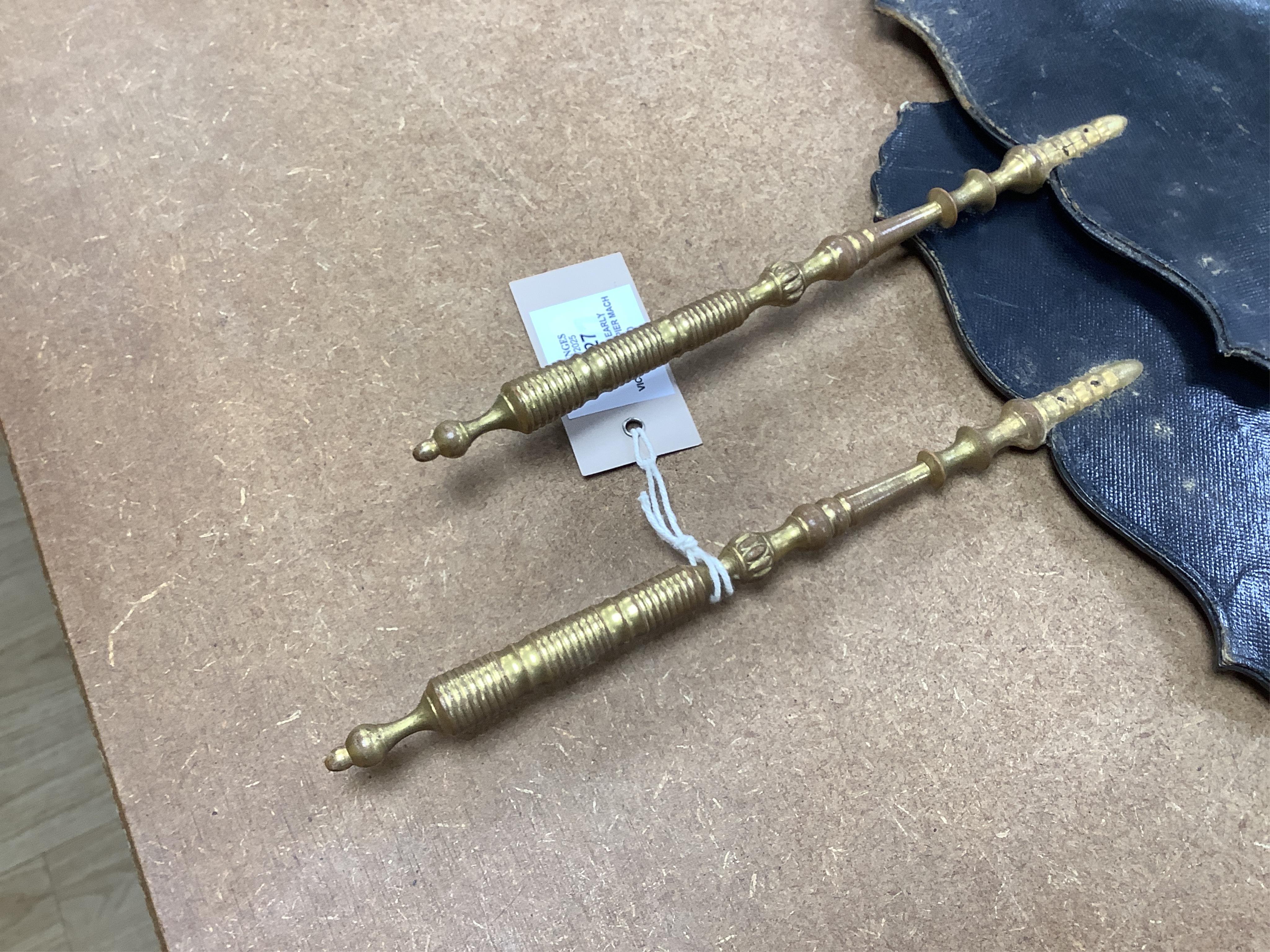 A pair of early Victorian papier maché hand screens, each with embroidered with cross stitched flowers, 41cm in length