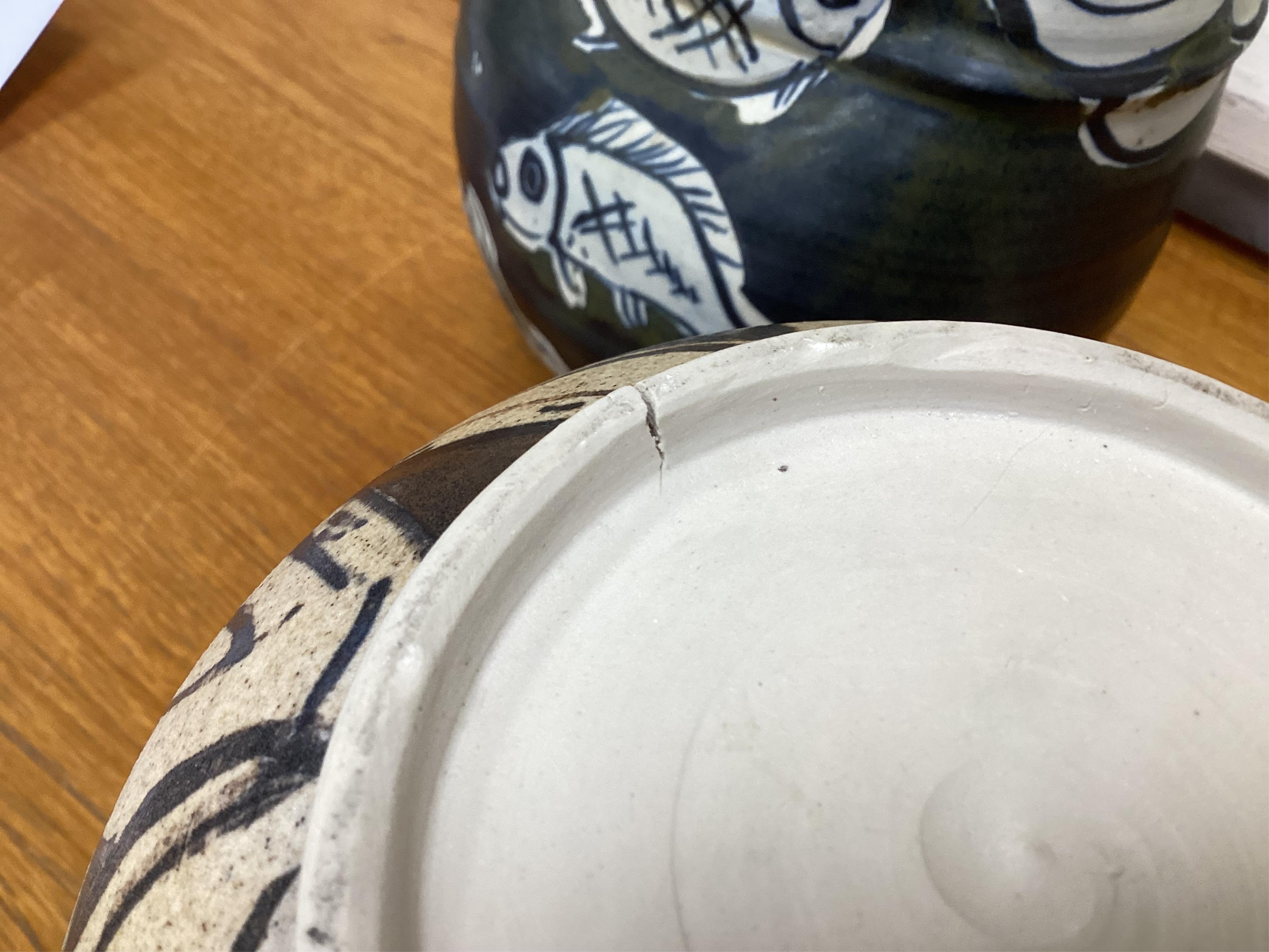 Lot 1357 , Yolande Beer (Sussex, contemporary), two Studio pottery vessels to include a vase in the form of a basket decorated with fish