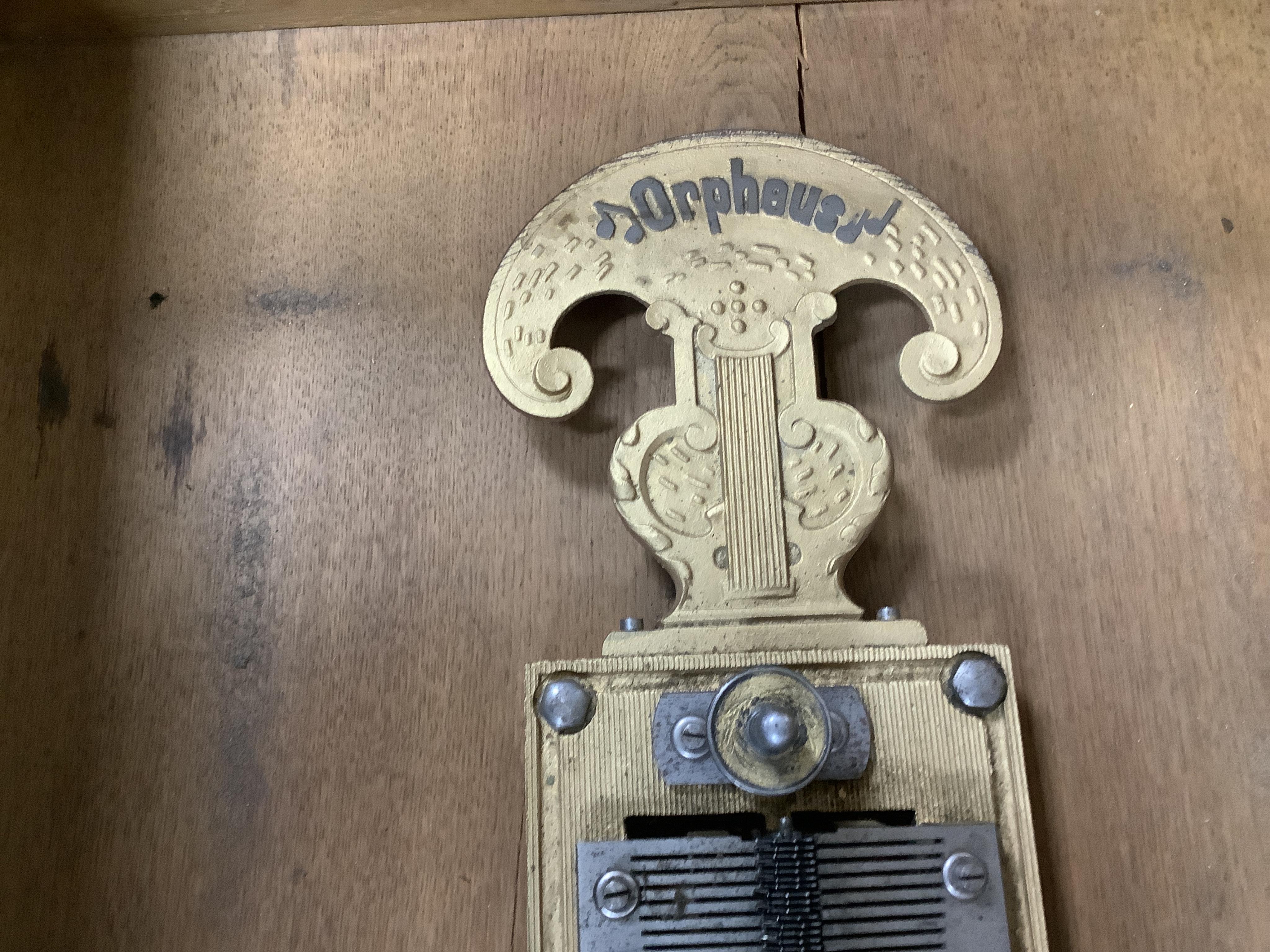Woodwork good, internal glazed section that houses the mechanism with a chipped corner; cabinet will benefit from a clean and wax; no key. Mechanism fully-wound but not working; steel flywheel shown in image 8 rotates when forced but it’s momentary motion cannot be sustained.