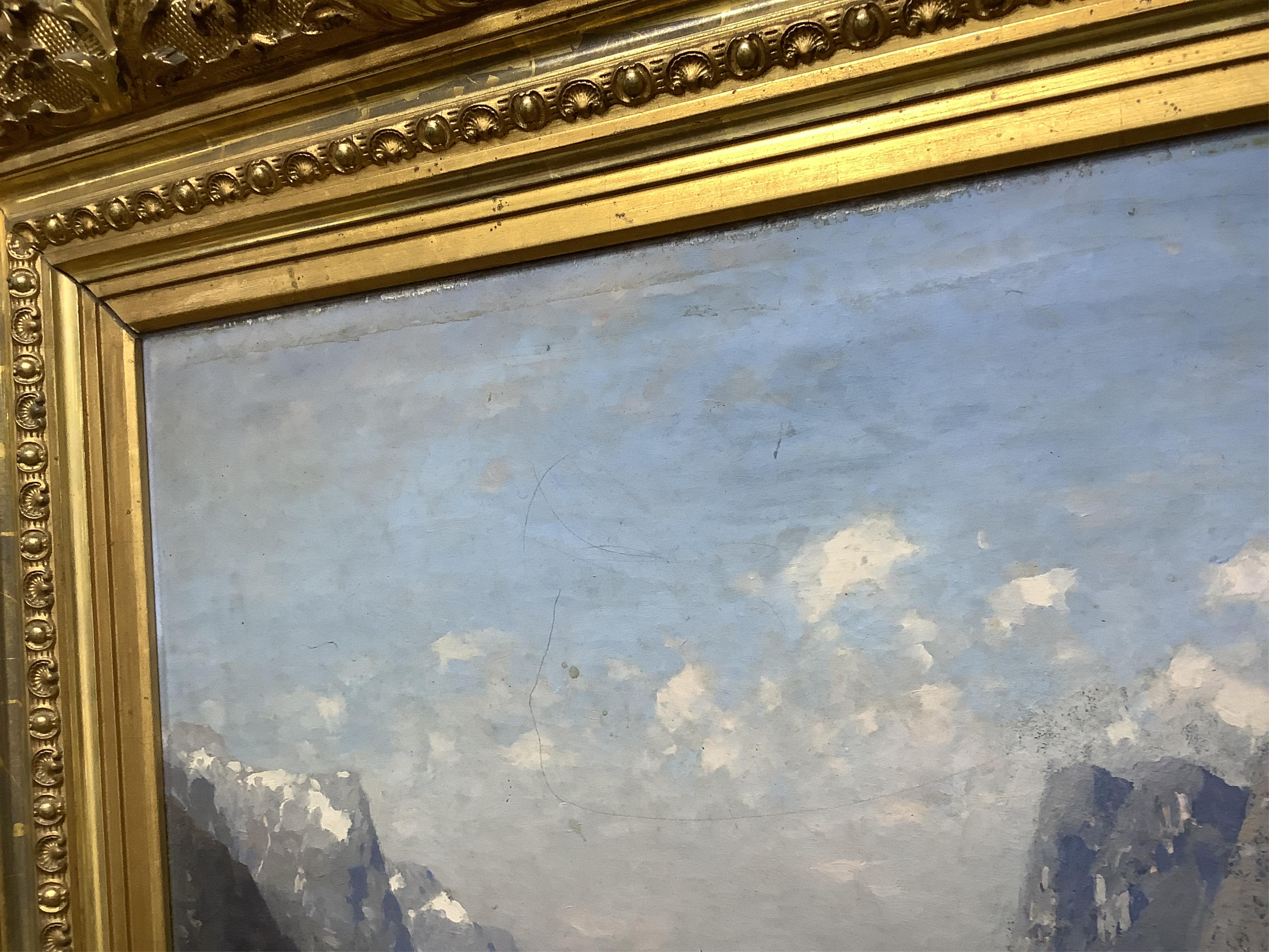 Both works showing craquelure and would benefit from a clean, the work with the liner to the distance with more noticeable craquelure and has slipped down in the frame and the top edge is showing rubbing marks. The other with some oil re-touches visible against the sky ground, image 10. Each frame with unsightly chips to gesso. Deceased estate and further provenance unknown.