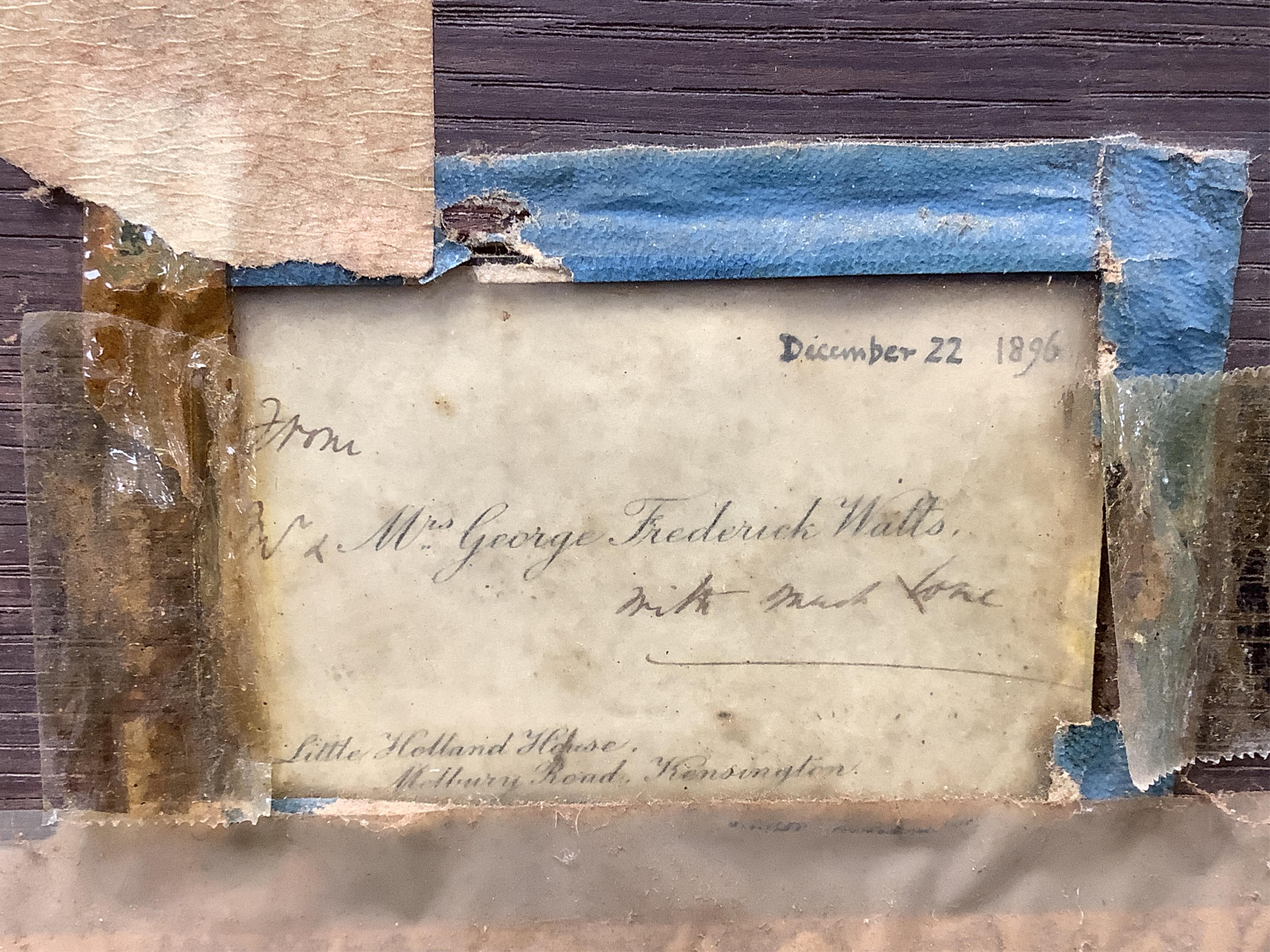 Portrait image is somewhat feint, on cream-discoloured paper with dirt spots and light creases, images 10 and 11; bottom rail of original oak frame lighter in colour than the rest. See image of GF Watts’s trade card attached verso. Signed and dated inscription appears to have the word Brighton in the middle. Provenance: offered for sale by the Shoolbred family, descendants of Jas. Shoolbred & Co., well-known furniture designers and makers based at their Tottenham Court Road department store.