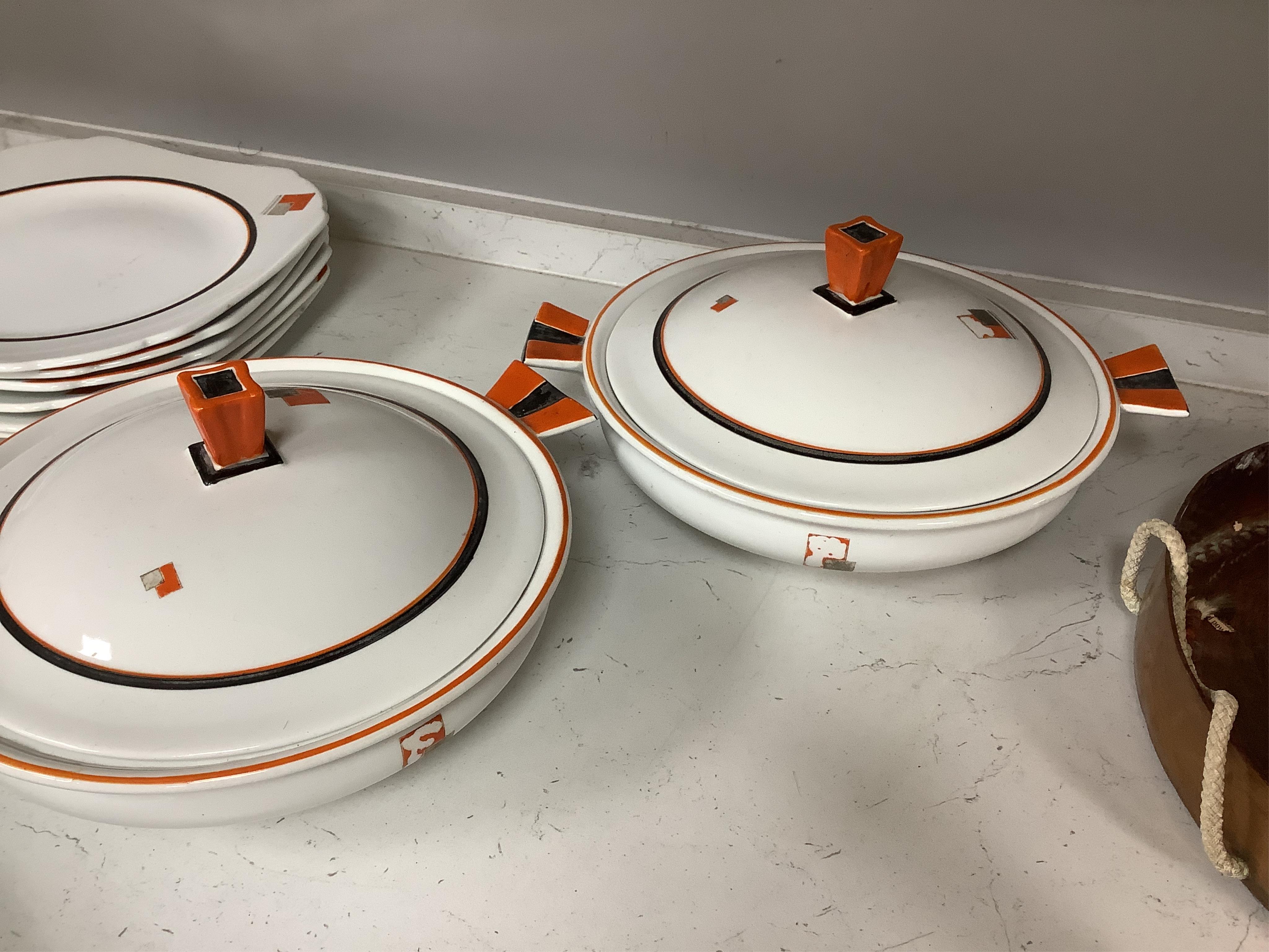 A Shelley Vogue-shape 44-piece part dinner service, and a Poole cheese dish and cover, latter 19x16cm.