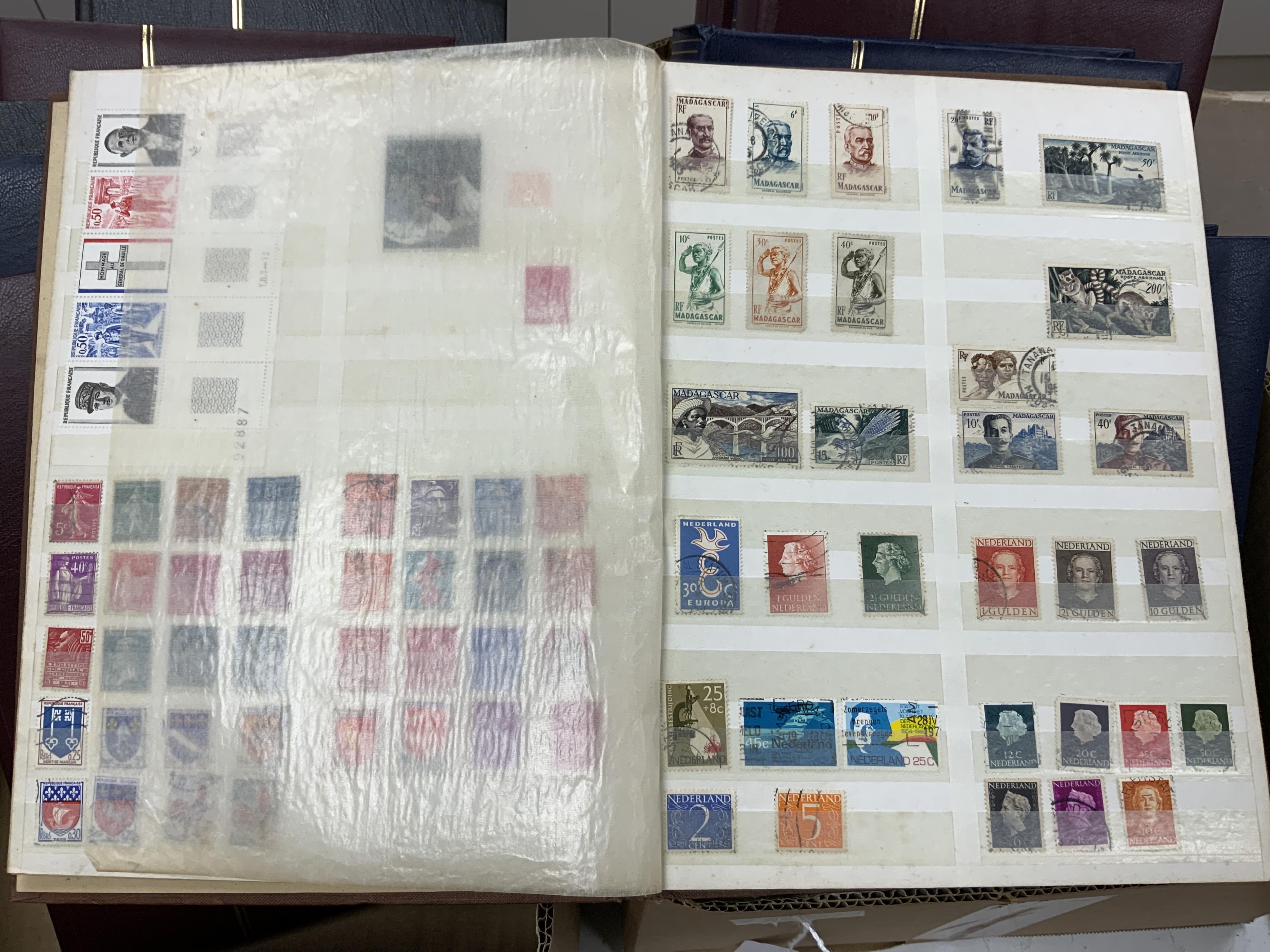 Lot 2161 , Thirteen stamp stock books containing a variety of World postage stamps, countries including; Australia, British Solomon Islands, Guernsey, Bermuda, Mauritius, Barbados, Malta, Egypt, Jersey, Luxembourg, etc., each album