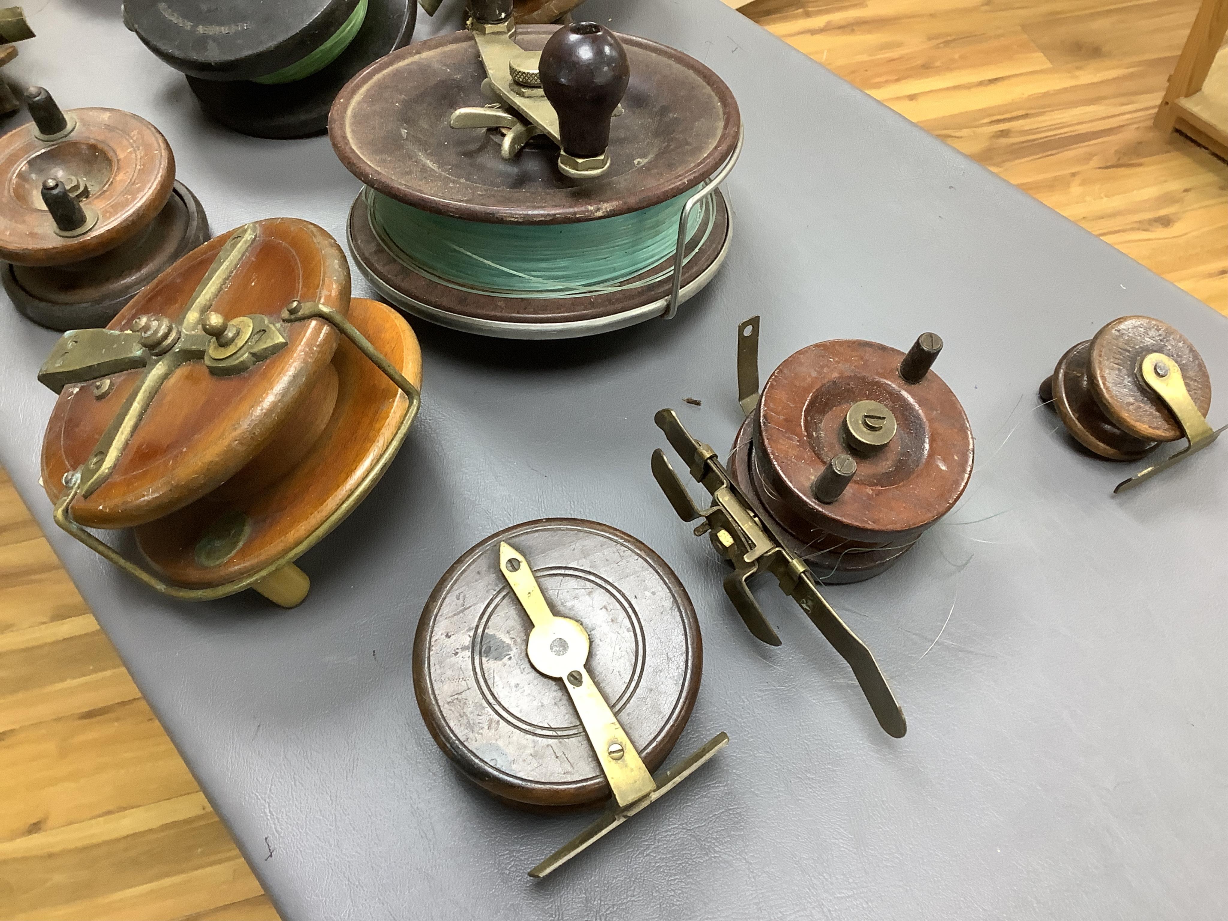 A collection of vintage fishing reels, including mahogany and brass examples one with patent number 13388/85, an Allcock Aerialite reel, an early 20th century brown leather wallet of fishing flies contained in vellum pockets