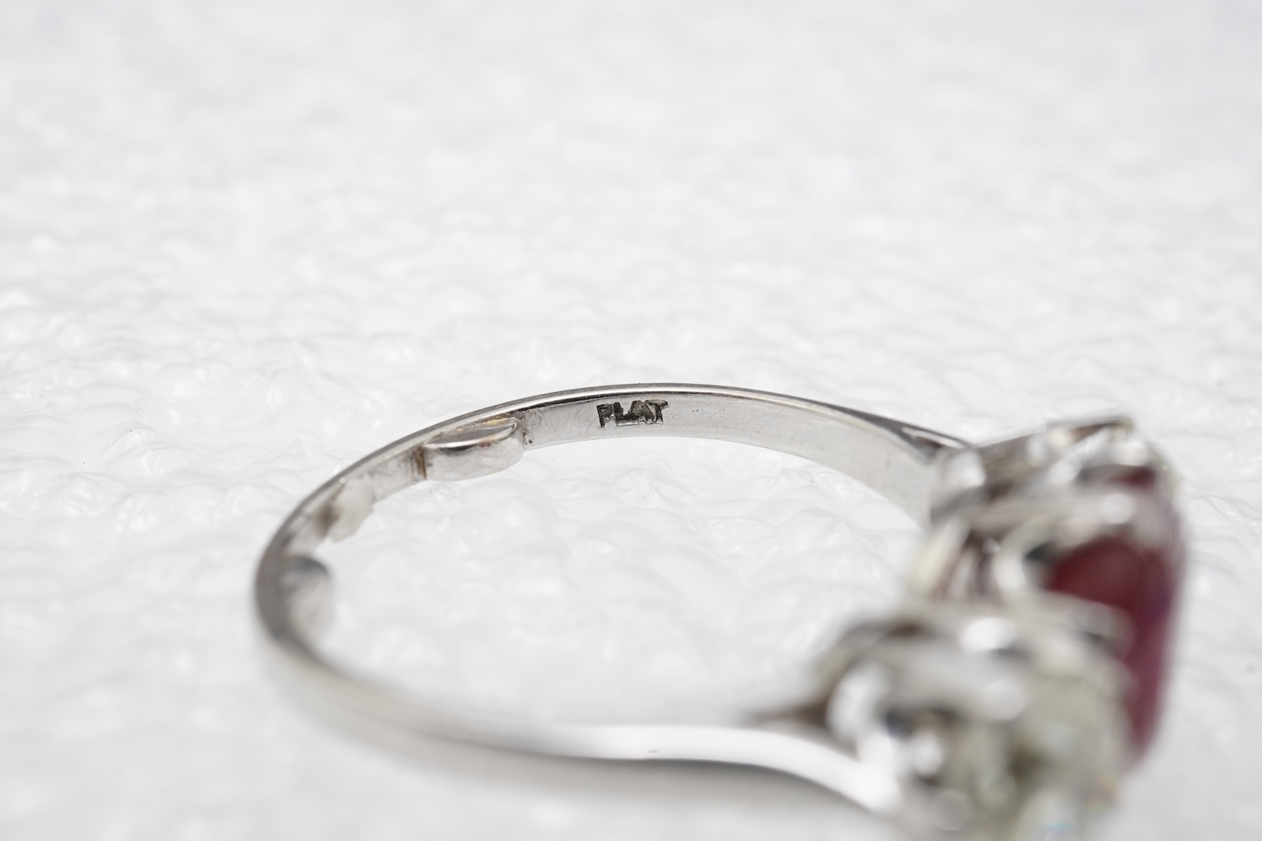 An attractive ruby and diamond ring, early 20th century, claw-set with a circular-cut ruby weighing approximately 1.70 carats, between cushion-shaped diamond shoulders totalling approximately 0.80 carats, mounted in platinum, size J1/2, sizing beads, stamped PLAT