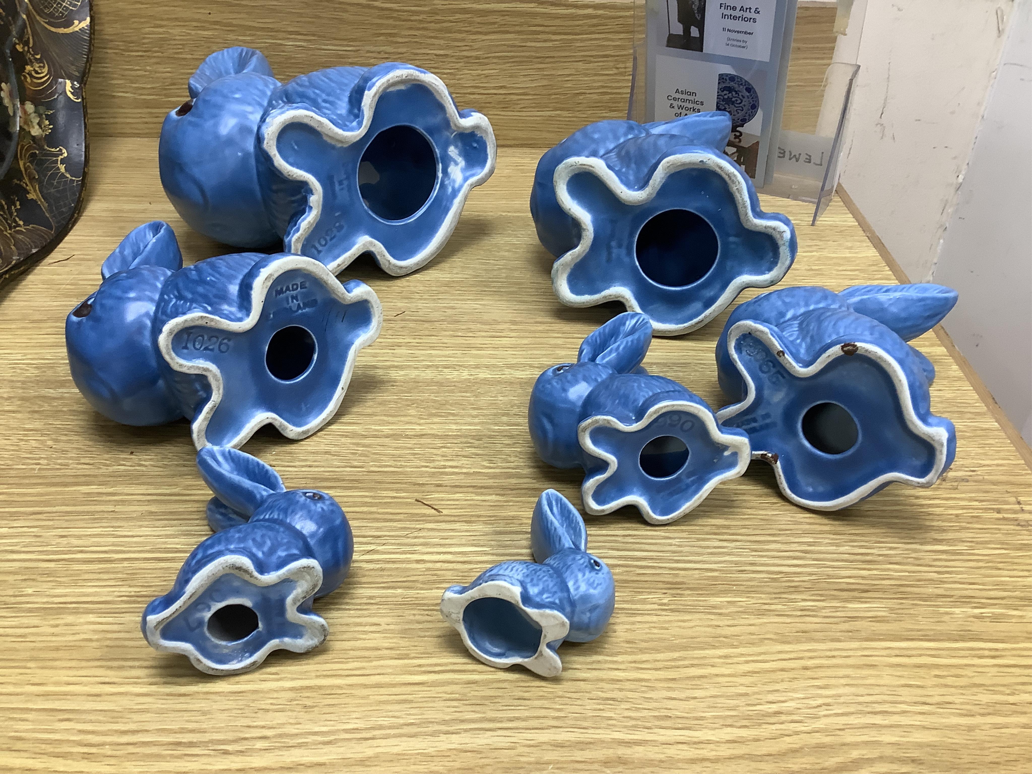 Images 8 to 11 all marked SylvaC; images 12 to 15 with impressed marks and mould numbers but not marked SylvaC. None marked Wade. Both SylvaC dogs ( 1382) good. Largest bunny (1028) with small graze at top of right ear, image 16. Other SylvaCs good. Largest blue bunny (1028) with shallow graze at left foot, image 17. Remaining seven cream bunnies - one with two tiny glaze imperfections, teapot one pre-firing chip at front left foot, image 18.