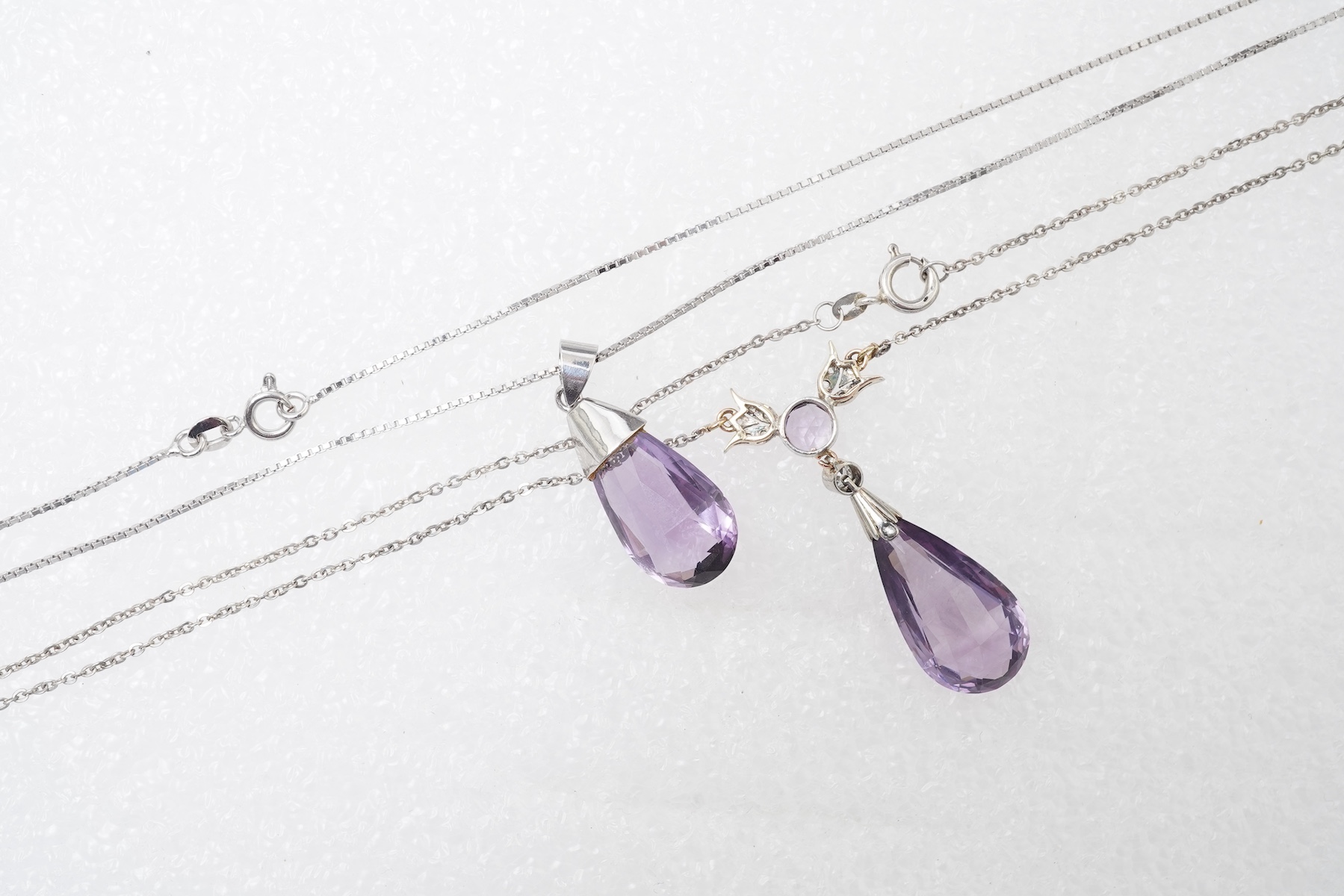 Two amethyst pendants and an amethyst and marcasite ring, comprising: a pendant, set with an amethyst briolette, to a foliate surmount set with a circular-cut amethyst and diamonds, pendant length 4cm, chain length 49.5cm; an additional pendant set with a briolette amethyst on a white gold chain, pendant 3cm, chain length 58cm, stamped 750, gross weight approximately 7.5 grams; an amethyst and marcasite ring mounted in silver, size K