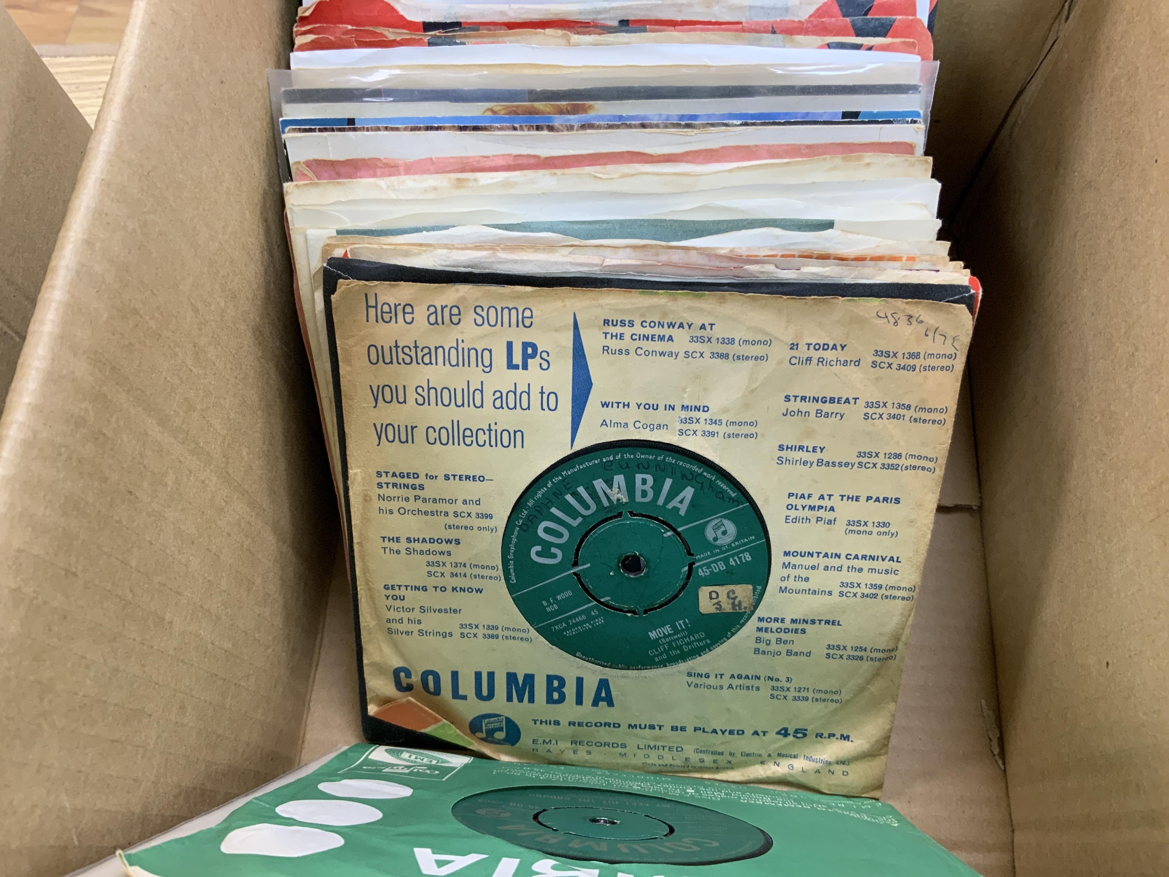 Two boxes of 7 inch singles, including a good selection of demo pressings with printed labels, artist include; Jeff Beck, Small Faces, The Beatles, The Beach Boys, Deep Purple, The Doors, Elton John, The Kinks, the Mamas and the Papas, David Bowie, Queen, The Who, Uriah Heep, T-Rex, Nat King Cole, the Everly Brothers, Ella Fitzgerald, Buddy Holly, The Crickets, The Rolling Stones, etc.