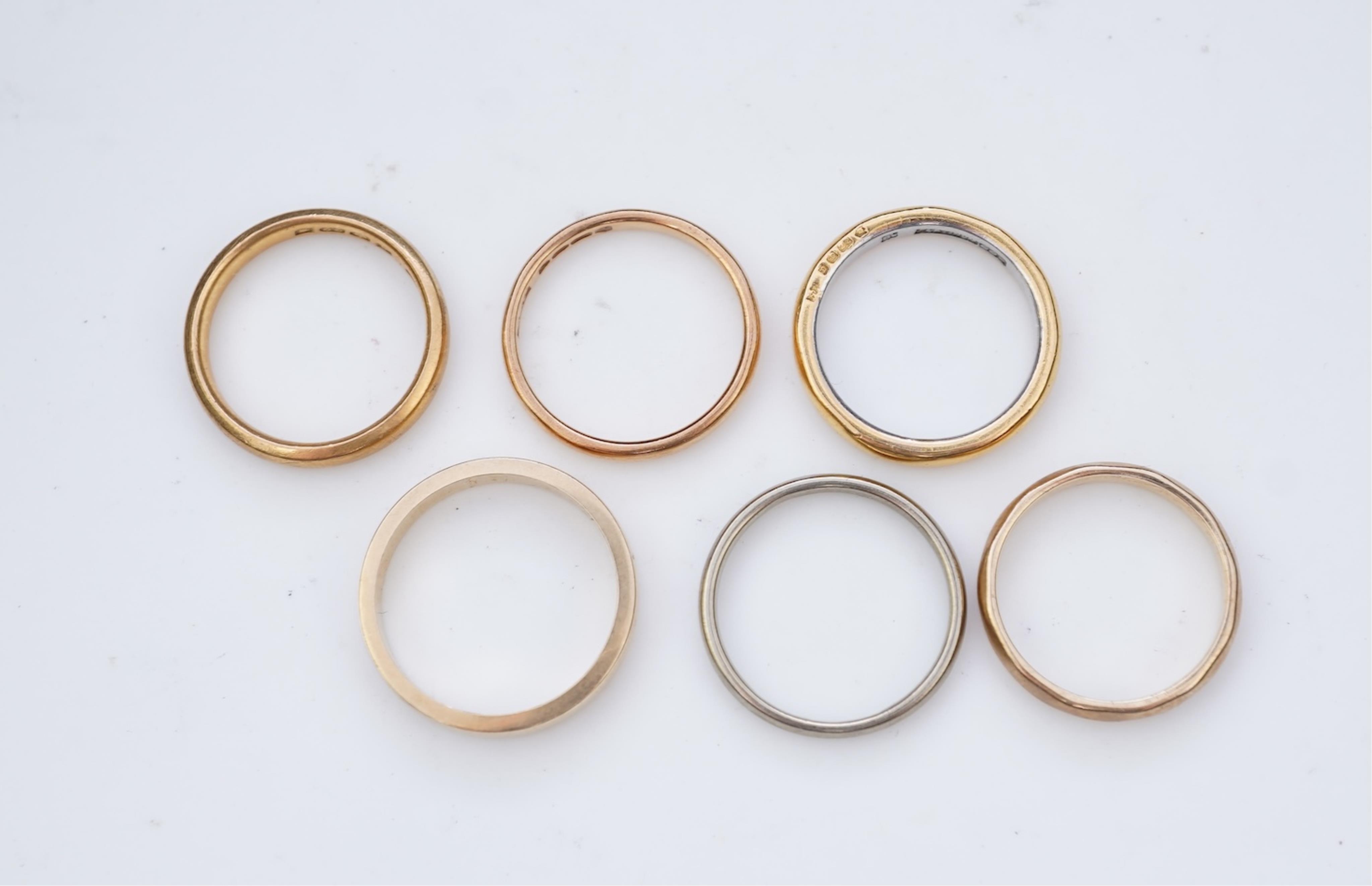 A collection of six gold wedding bands, comprising: two in 22ct gold, British hallmarks, combined gross weight approximately 7 grams; a 22ct gold wedding band, the interior lined with platinum, British hallmarks for 22ct gold, stamped 22ct PLATINUM, gross weight approximately 4.5 grams; a wedding band, rubbed British hallmarks, gross weight 2 grams; and two 9ct gold wedding bands, each with British hallmarks, combined gross weight approximately 4.5 grams, sizes K1/2-N