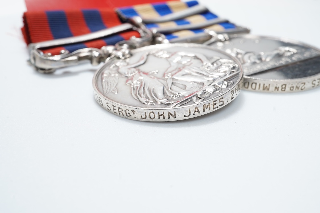 A Victoria military medal pair, awarded to 1408. Sergt. John James. 2nd. Battalion Middlesex Regiment., comprising of the India General Service medal with a clasp for Hazara 1891, together with an Egypt medal with clasps