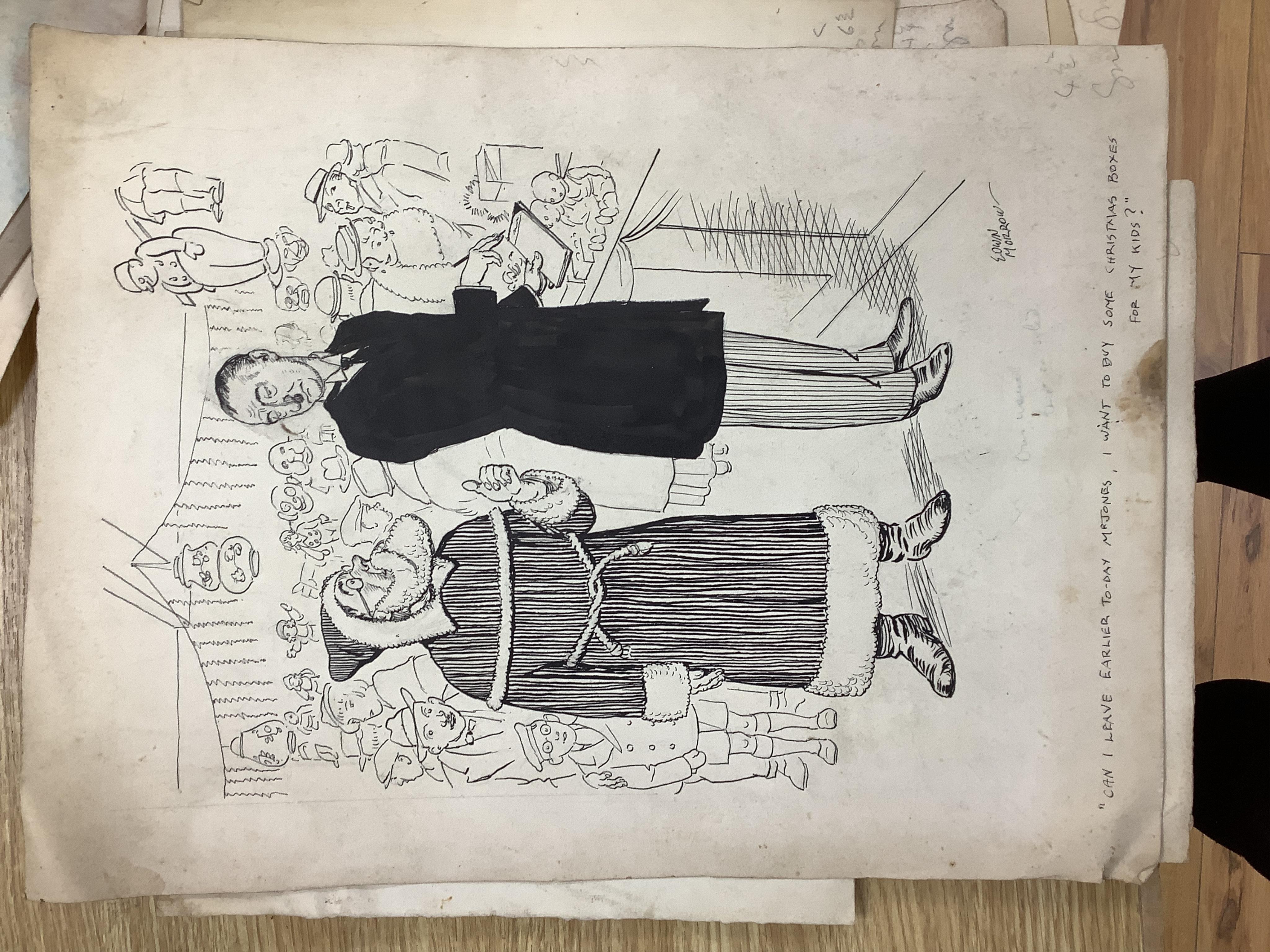 Only two George Morrows, each 34x49cm. 37 cartoons by Edwin. "Due to past issues with items being damaged in transit, we regret to inform you that we are unable to offer packing and posting services on picture lots in this sale. This is non-negotiable. Picture lots must be collected in person, or external packing companies can be recommended. Thank you for your understanding."