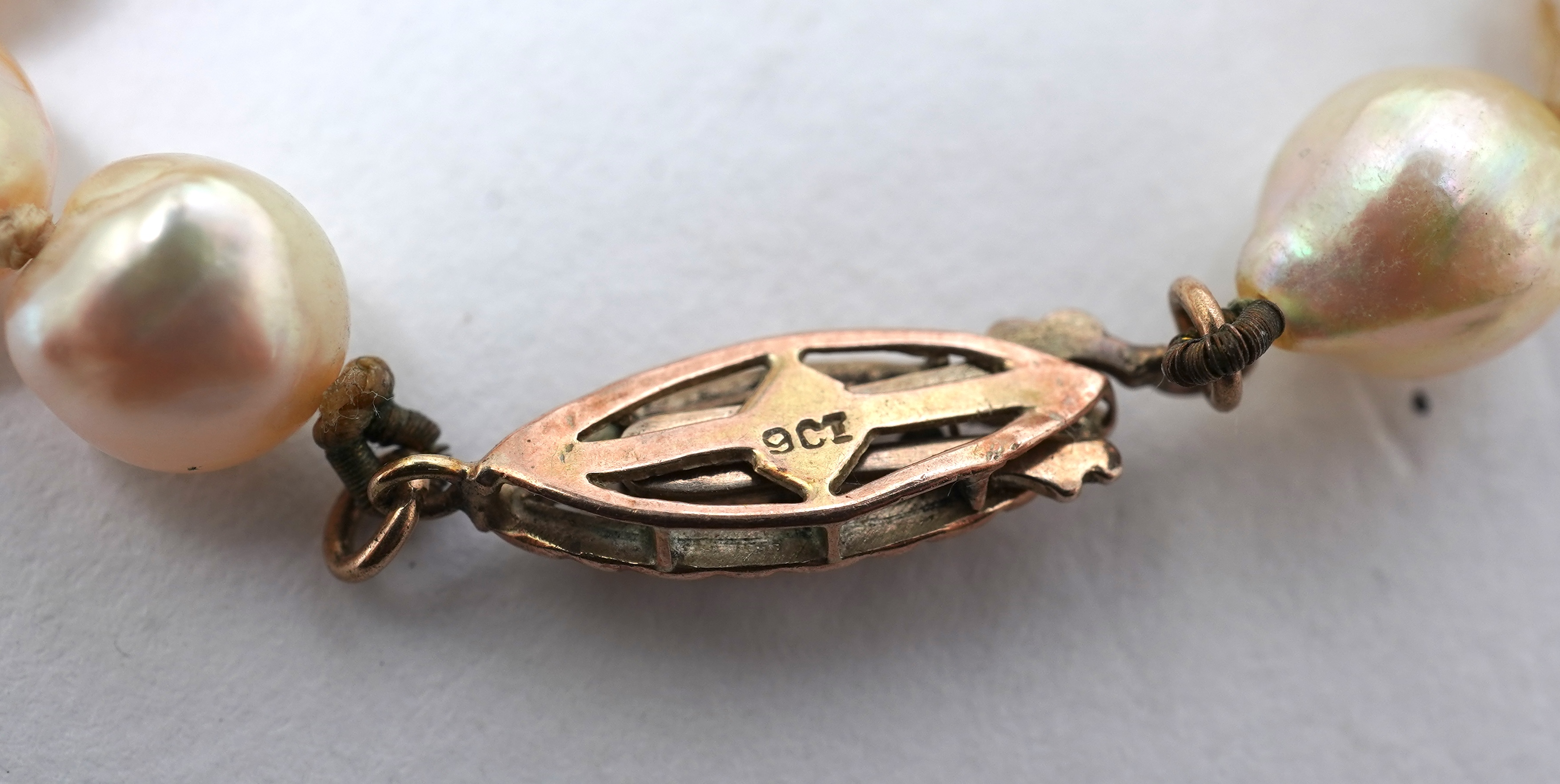 A collection of four cultured pearl necklaces, comprising: a necklace composed of conjoined cultured pearls, to a spherical gold clasp set with brilliant-cut diamonds, 47cm, stamped 750; a cultured pearl necklace suspending a fringe of conjoined cultured pearls, to a concealed clasp, length 39cm, stamped 750; and two single strand cultured pearl necklaces, length 39.5 and 45cm, clasps stamped 9ct and 375 respectively