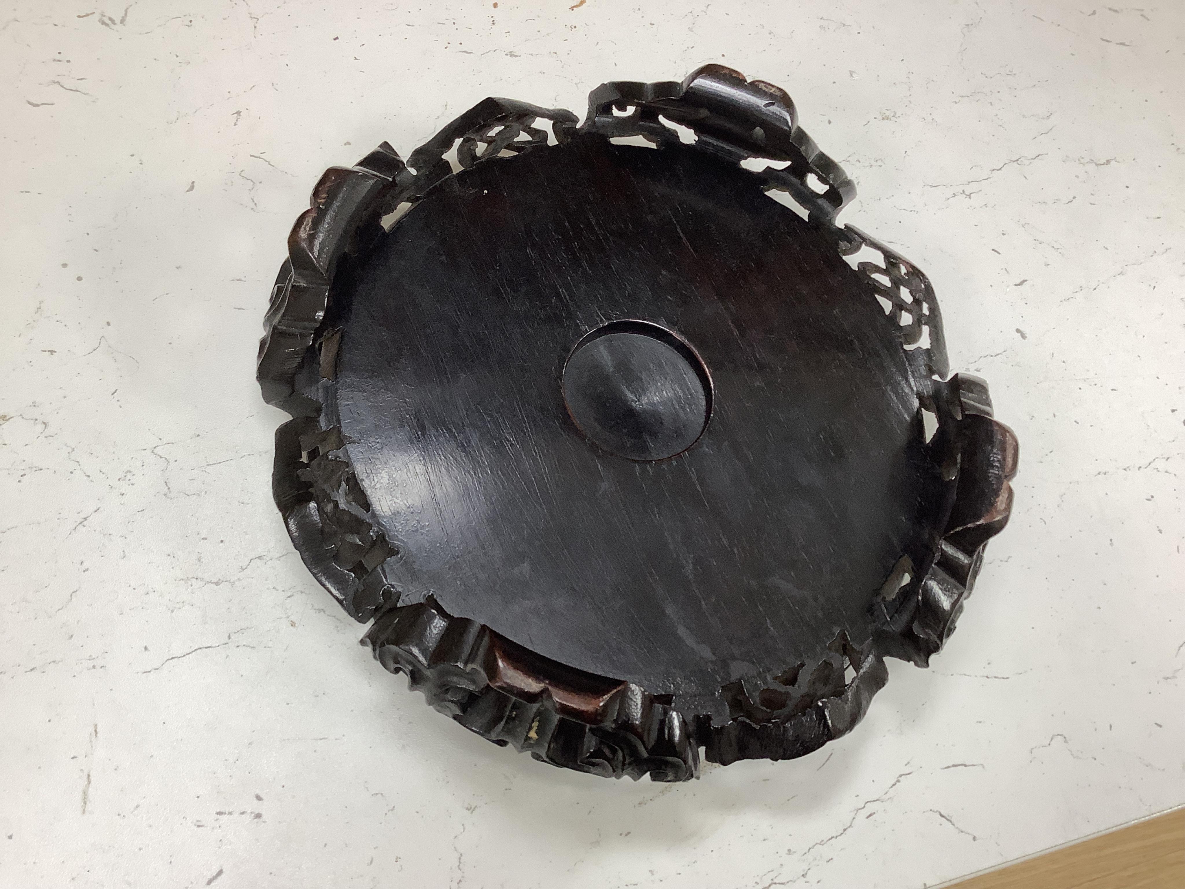 An 18th century Chinese famille rose figural bowl, on wooden stand, 34cm diameter.