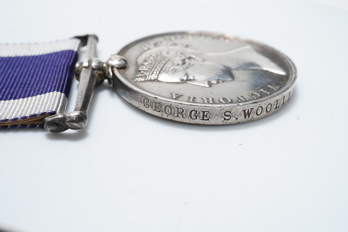 A Victoria and GV medal pair awarded to George S. Woolley, Boatman, H.M. Coast Guard, comprising of a Victoria Royal Naval Long Service and Good Conduct medal and a GV First World War 1914-1918 medal