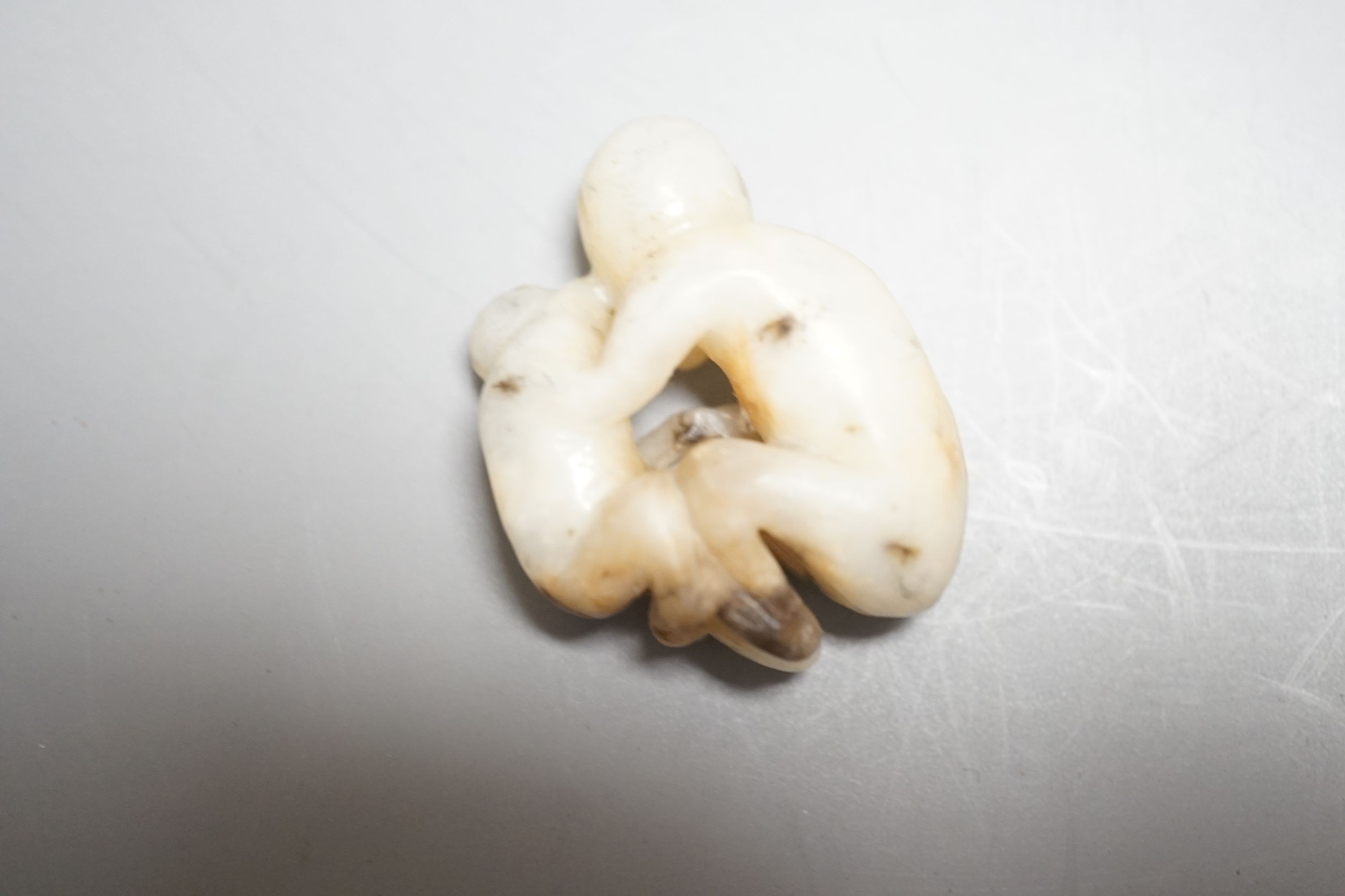 A 19th century Chinese famille rose bowl and saucer, a blue and white tea bowl on stand, a hardstone carving and three 18th century blue and white plates