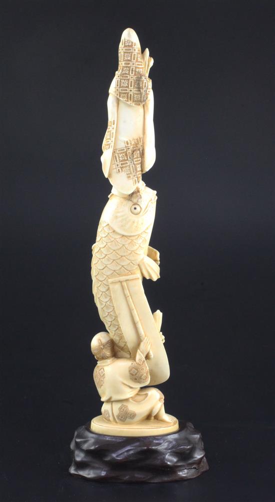A Japanese ivory okimono of Kwannon standing upon a giant carp, early 20th century, supported by a seated fisherman, three character signature to a red lacquer plaque, 24.3cm, wood stand