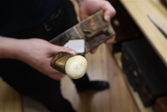 There are several fine cracks to ivory head, which also has plugged hole. Something has been sheared off the back below her neck tie. There are several scratches to the metal which is discoloured in areas. Marble also has several scratches and chips to all edges and corners