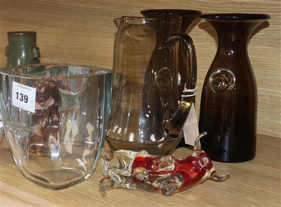 A Kosta Boda etched glass vase, a Scandinavian glass jug and a pair of vases