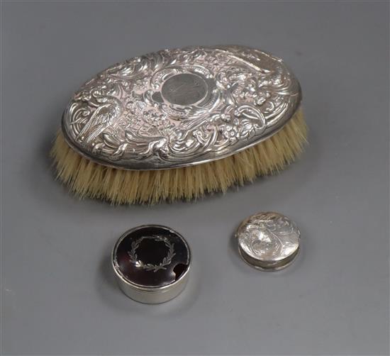 An embossed white metal clothes brush and two silver pill boxes (one a.f.).