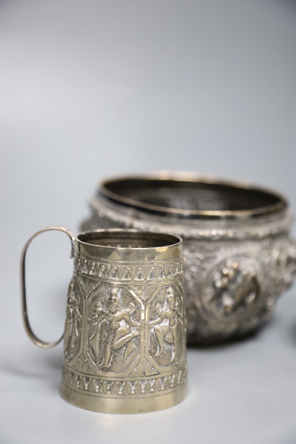 A 19th century Indian white metal embossed sugar bowl, a christening mug and a small brass bowl. (3)