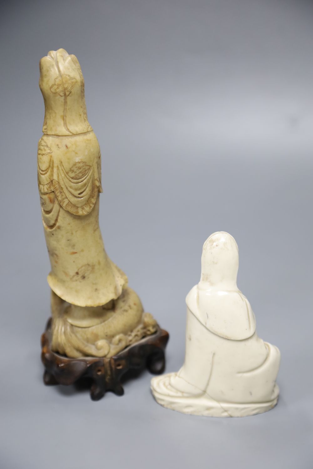 The soapstone figure is screwed to base, has a repair or natural fault to back of robe, there are also other natural faults and inclusions. The wooden base is missing section at back. The other figure is heavily cracked and restuck.