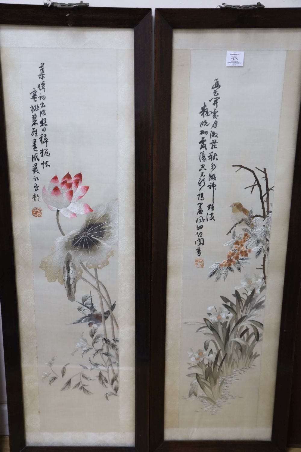 Lot 457A, A set of four Chinese embroidered silk pictures worked with birds on flowering branches, each 119 x 38.5cm (overall)