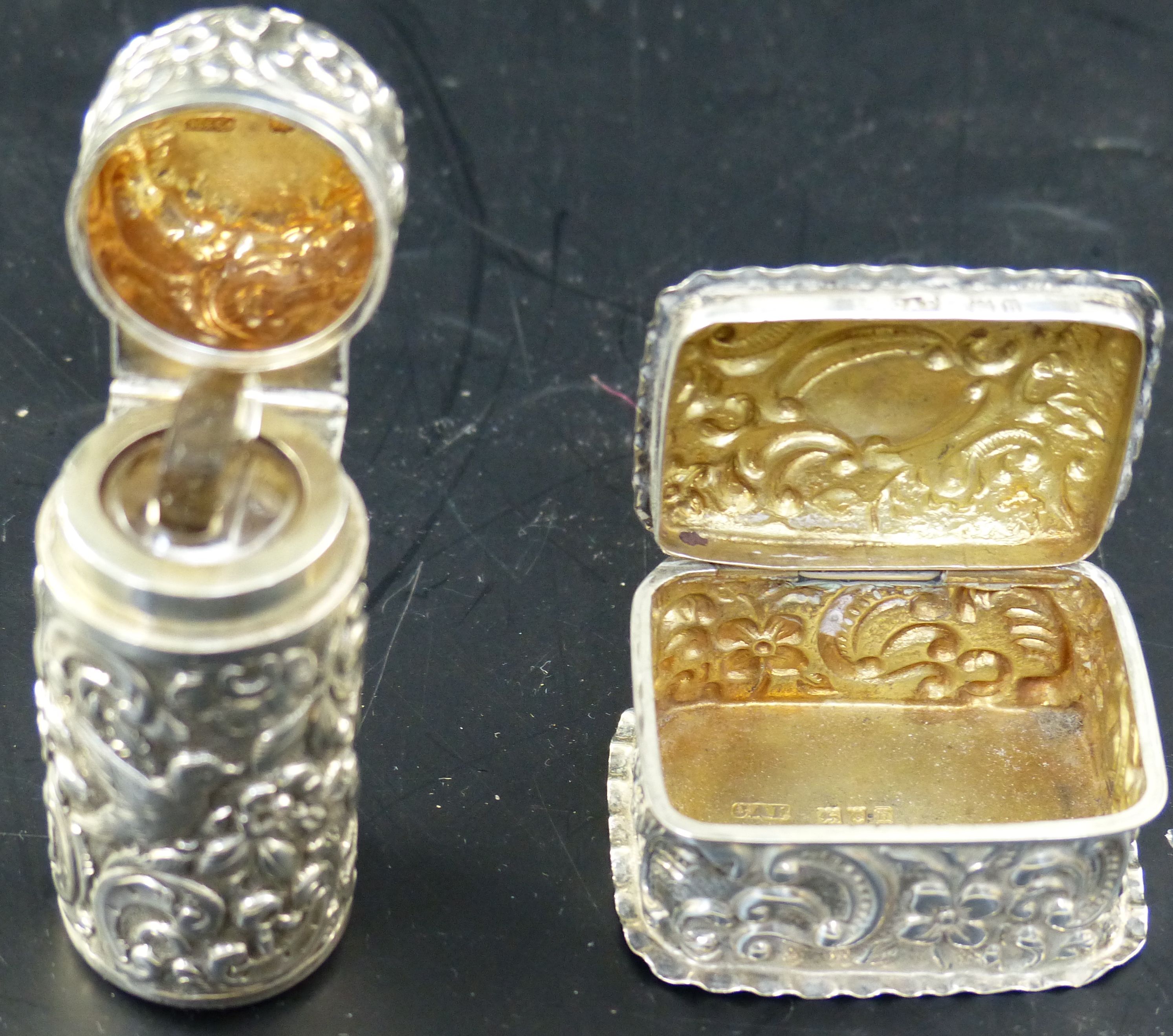 A silver rectangular patch box, with crimped border, chased with 'C' scrolls and flowers, height 4cm., and a silver cylindrical scent bottle, by Sampson Mordan & Co, London, 1891, 54mm.