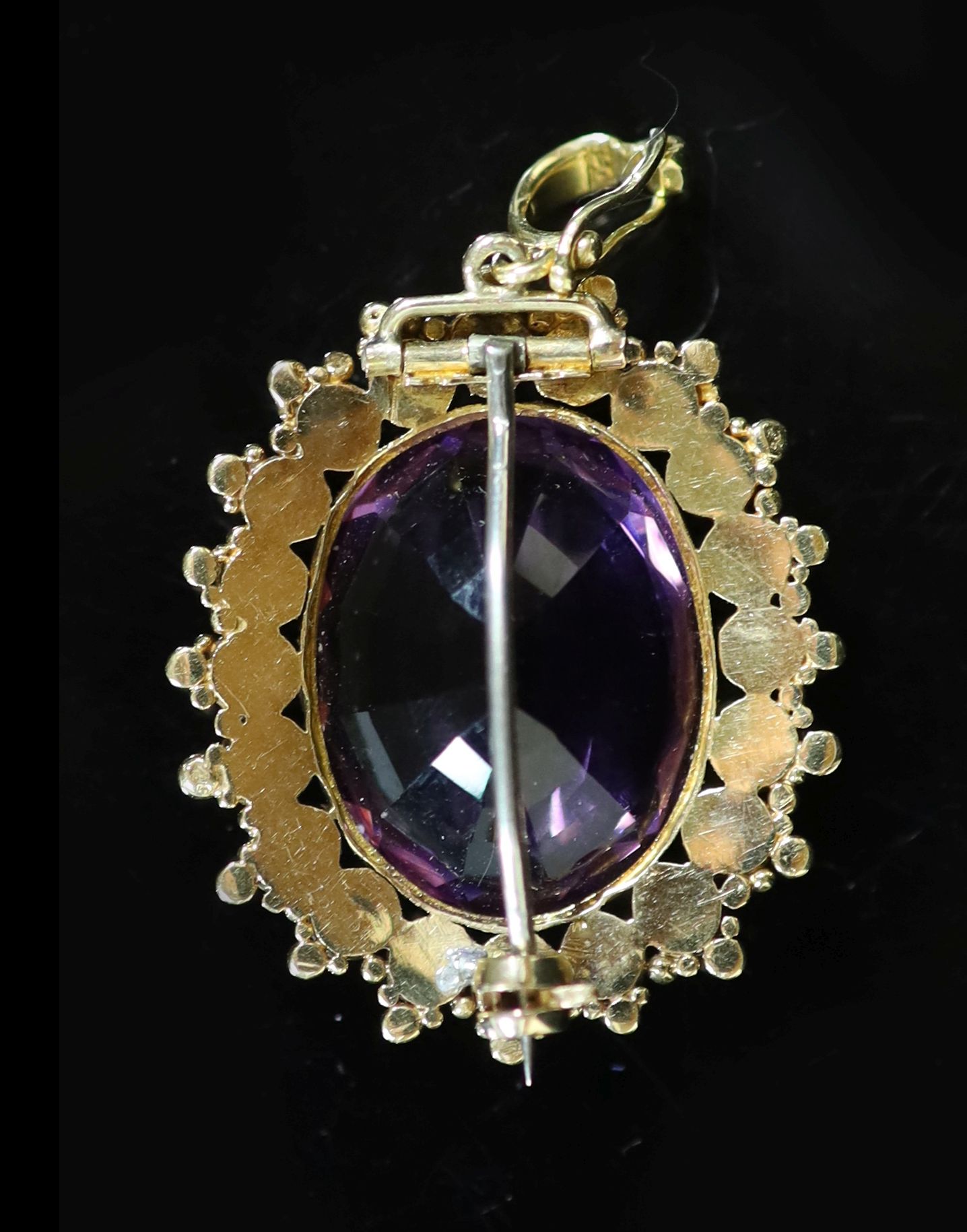 An early 20th century gold, amethyst and split pearl set oval pendant brooch,