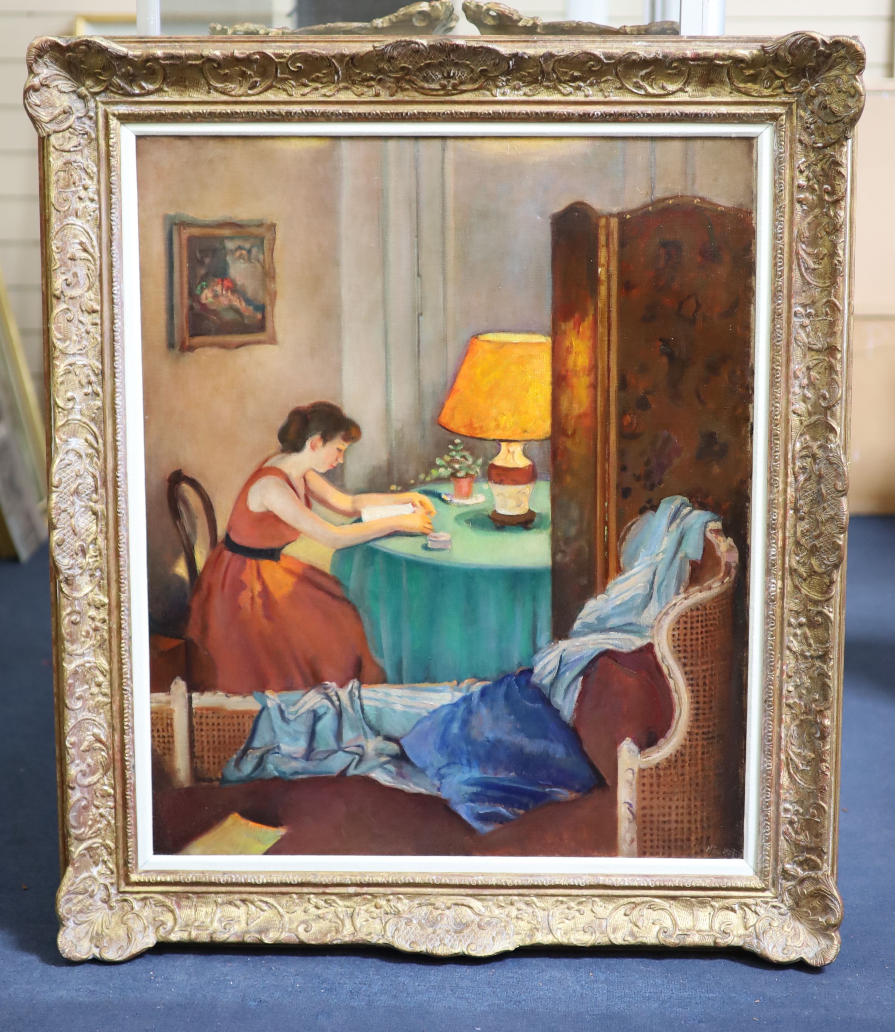 Lot 471 , Francis William Helps (1890-1972), Interior with woman reading, Oil on canvas, 76 x 63cm.
