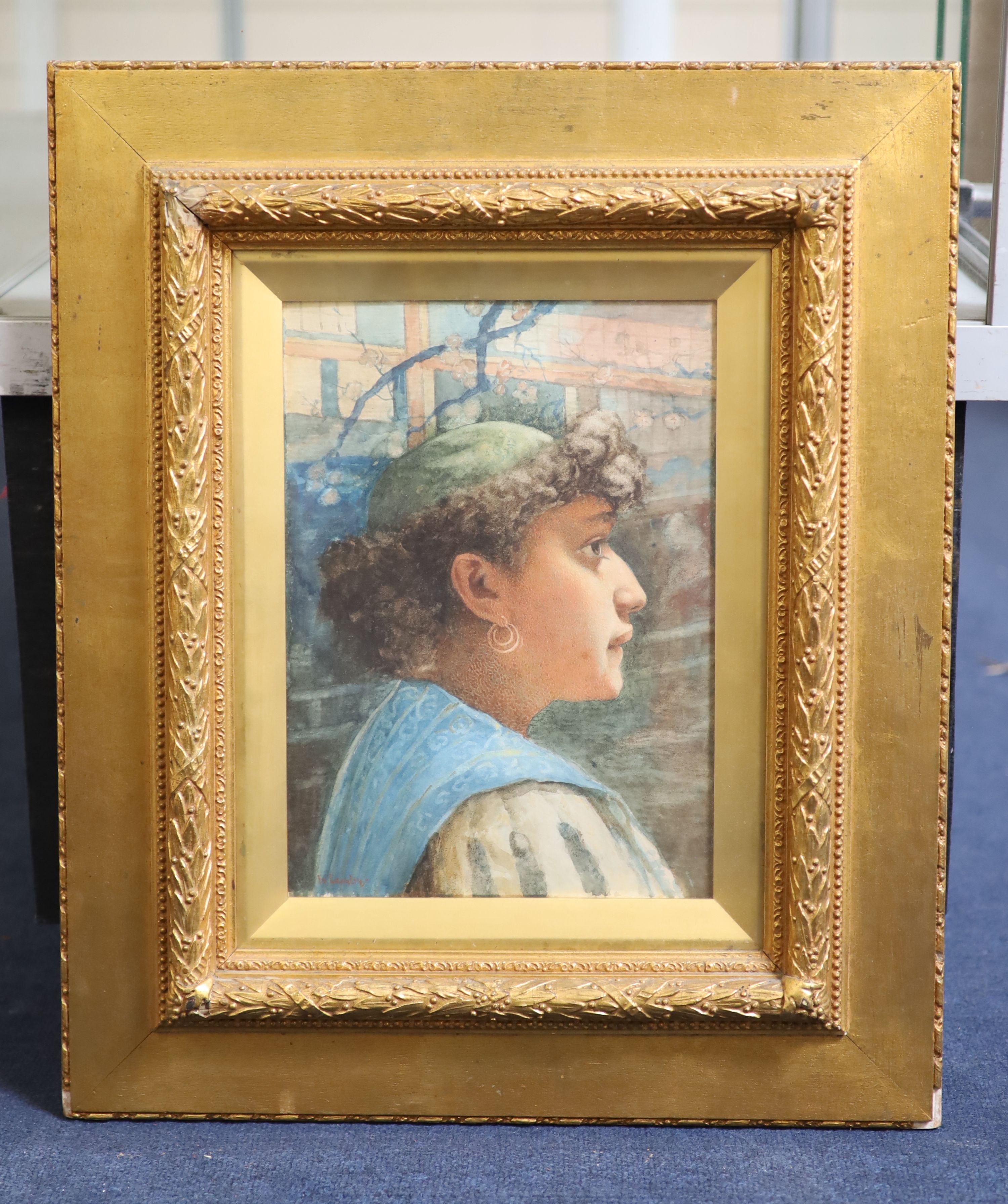 Watercolour on paper in honest original condition. Slight out for bulge of the paper near the top of her head. Colour is probably a little faded but still of fair strength. A few scattered dirt specs, no sign of any foxing. Signed lower left. Under glass in the original laurel leaf frame which has a few small dents and losses, label verso for Bellmans’ 67690.