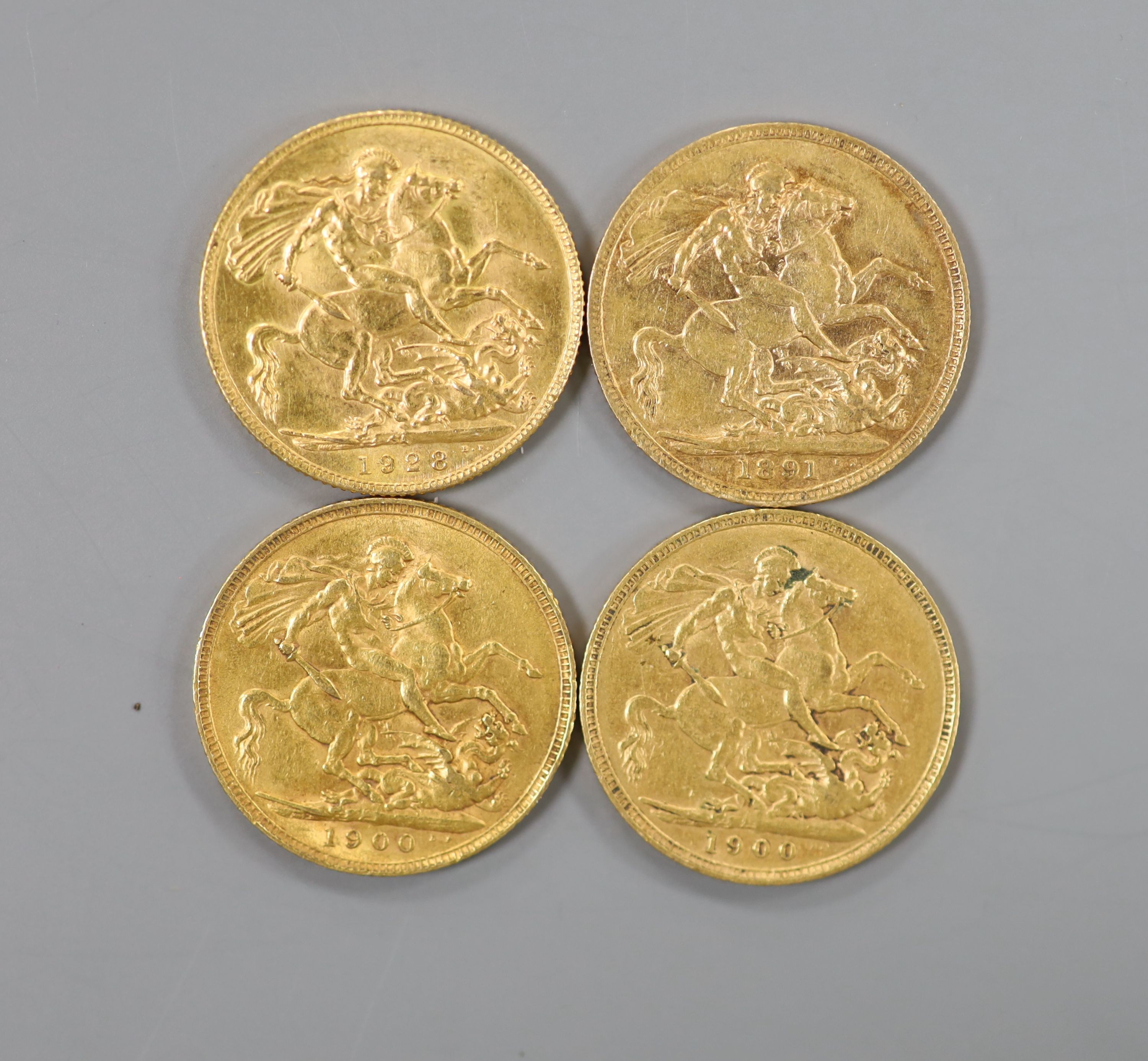 Lot 924 , Four gold sovereigns, 1991,1900(2) and 1928.