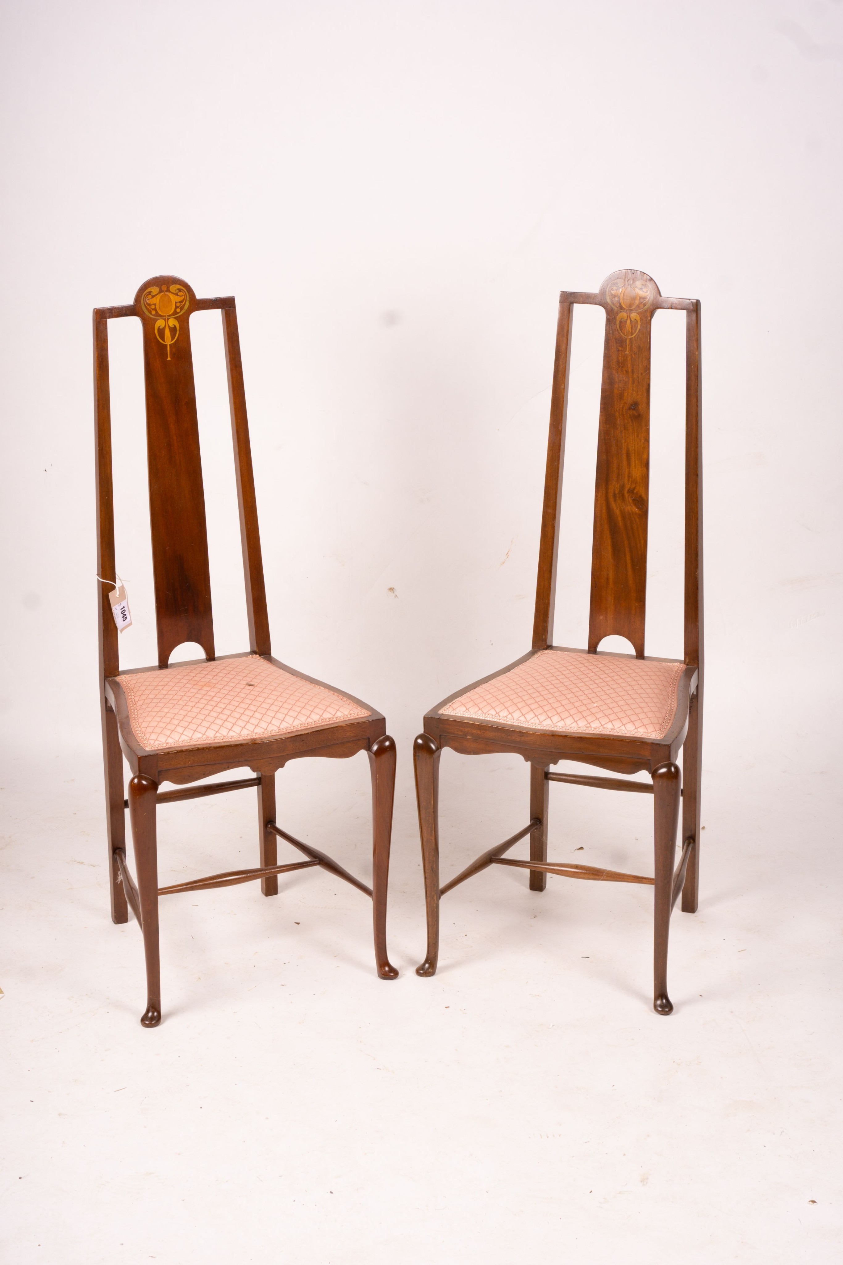 Lot 1045 , An Edwardian Art Nouveau inlaid mahogany towel rail and a pair of matching salon chairs (3)