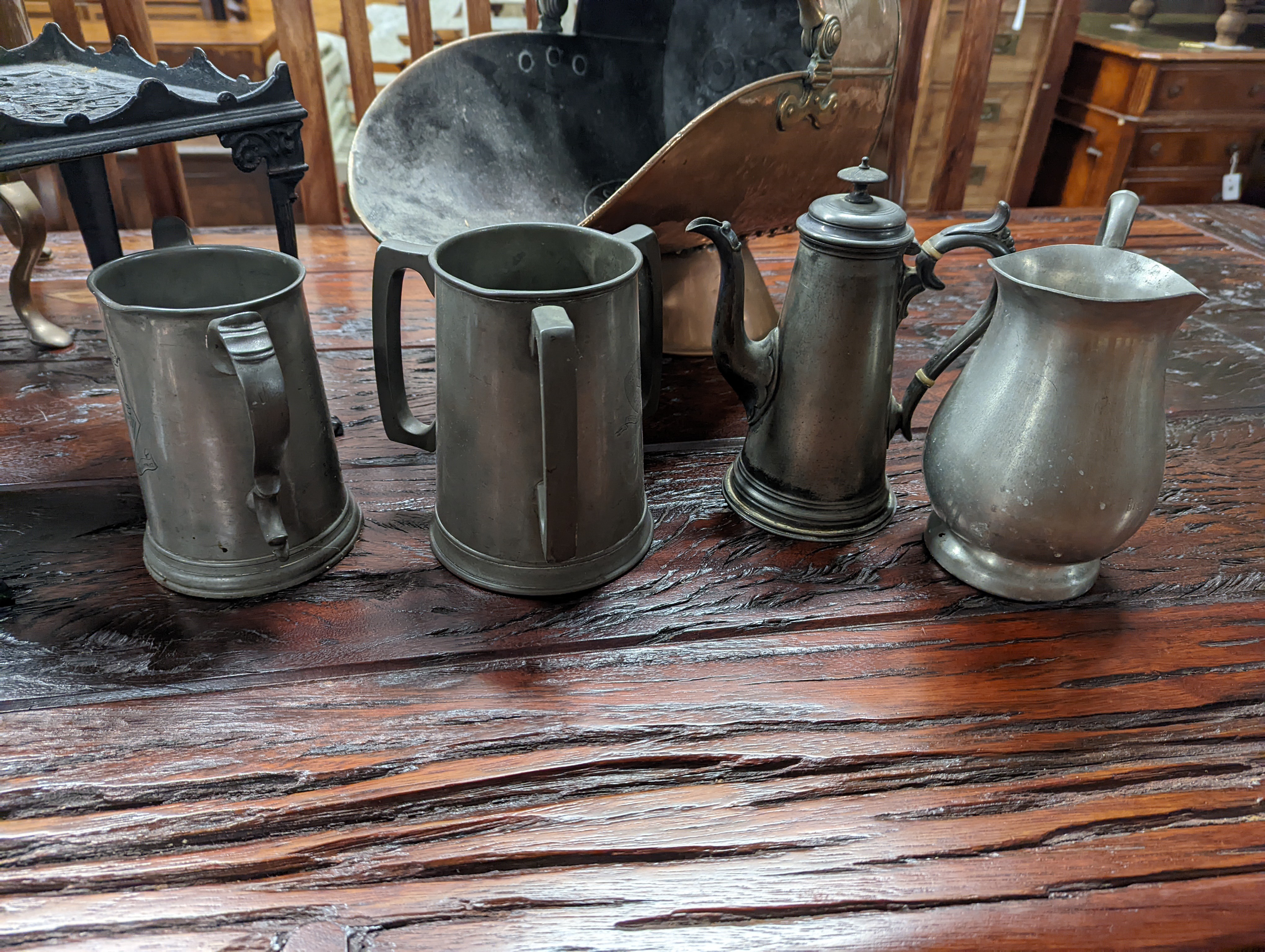 A Victorian copper coal scuttle, a square cast iron trivet, pewter items etc.