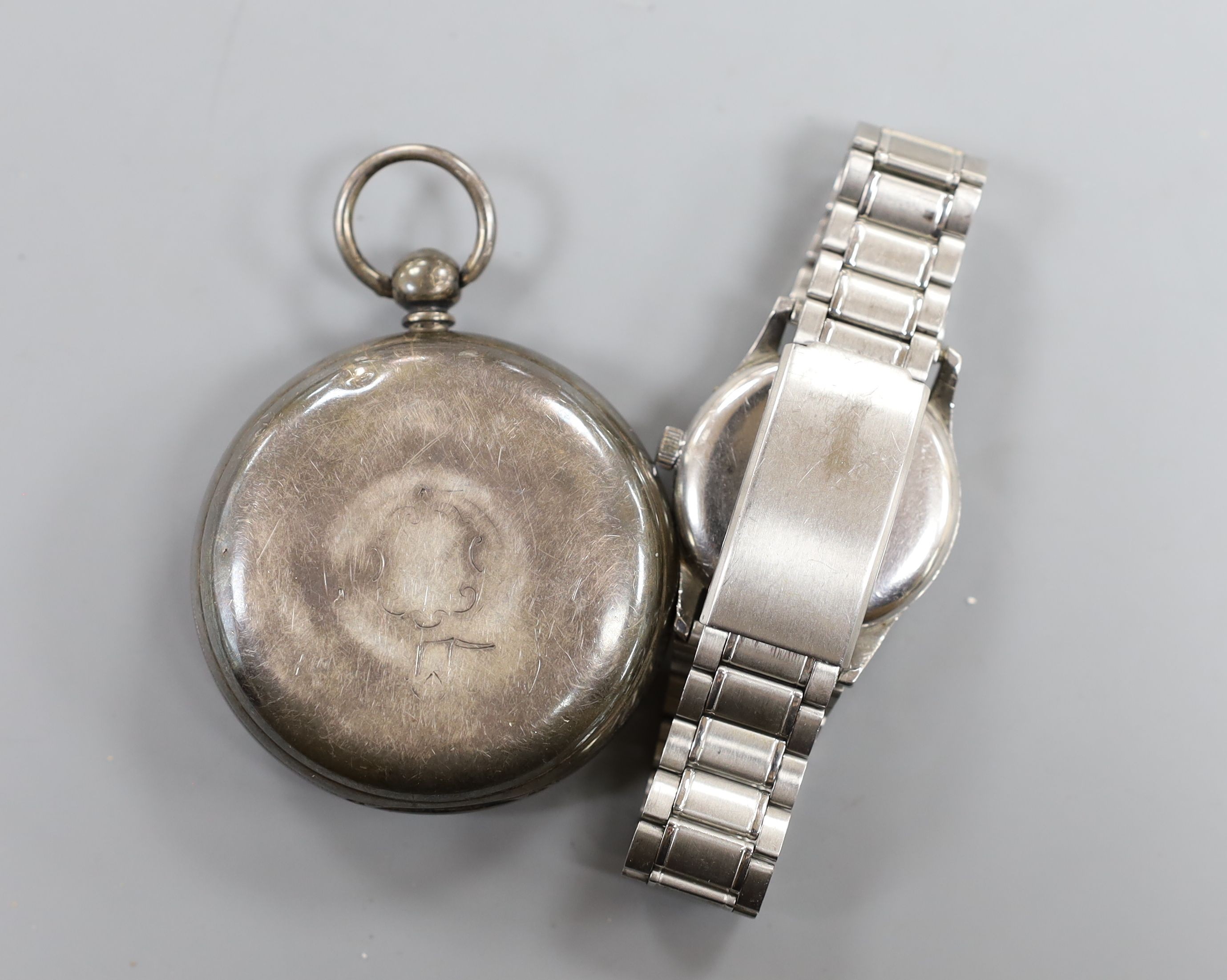 A gentleman's 1950's? stainless steel Baume automatic day/date wristwatch, on associated steel bracelet and a Victorian silver pocket watch.