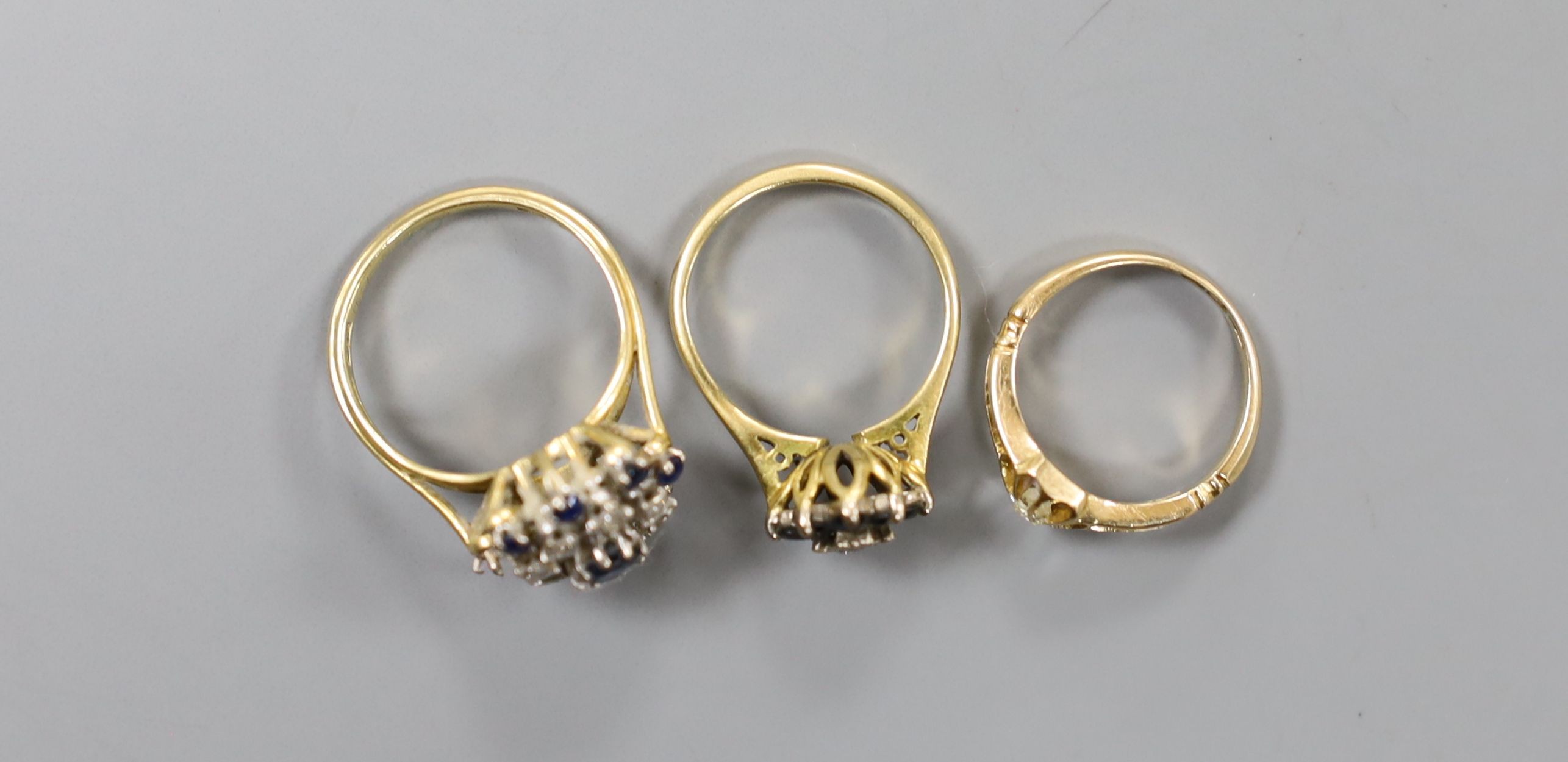 A George V 18ct gold and claw set solitaire diamond ring, size G/H and two later 18ct gold and gem set dress rings, gross 10.8 grams.