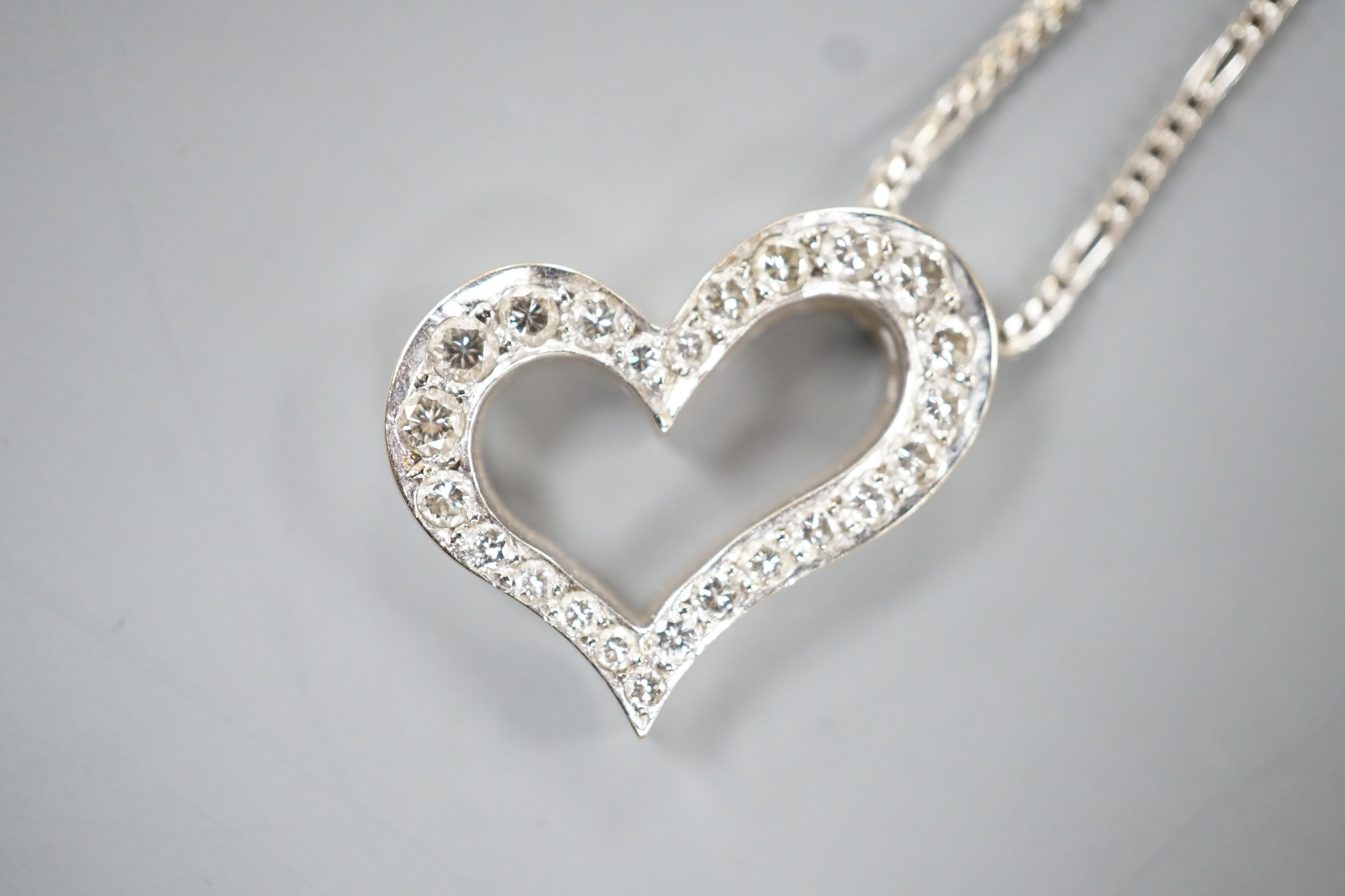 A modern 750 white metal and diamond set openwork heart pendant necklace, pendant width 22mm, chain, 40cm,