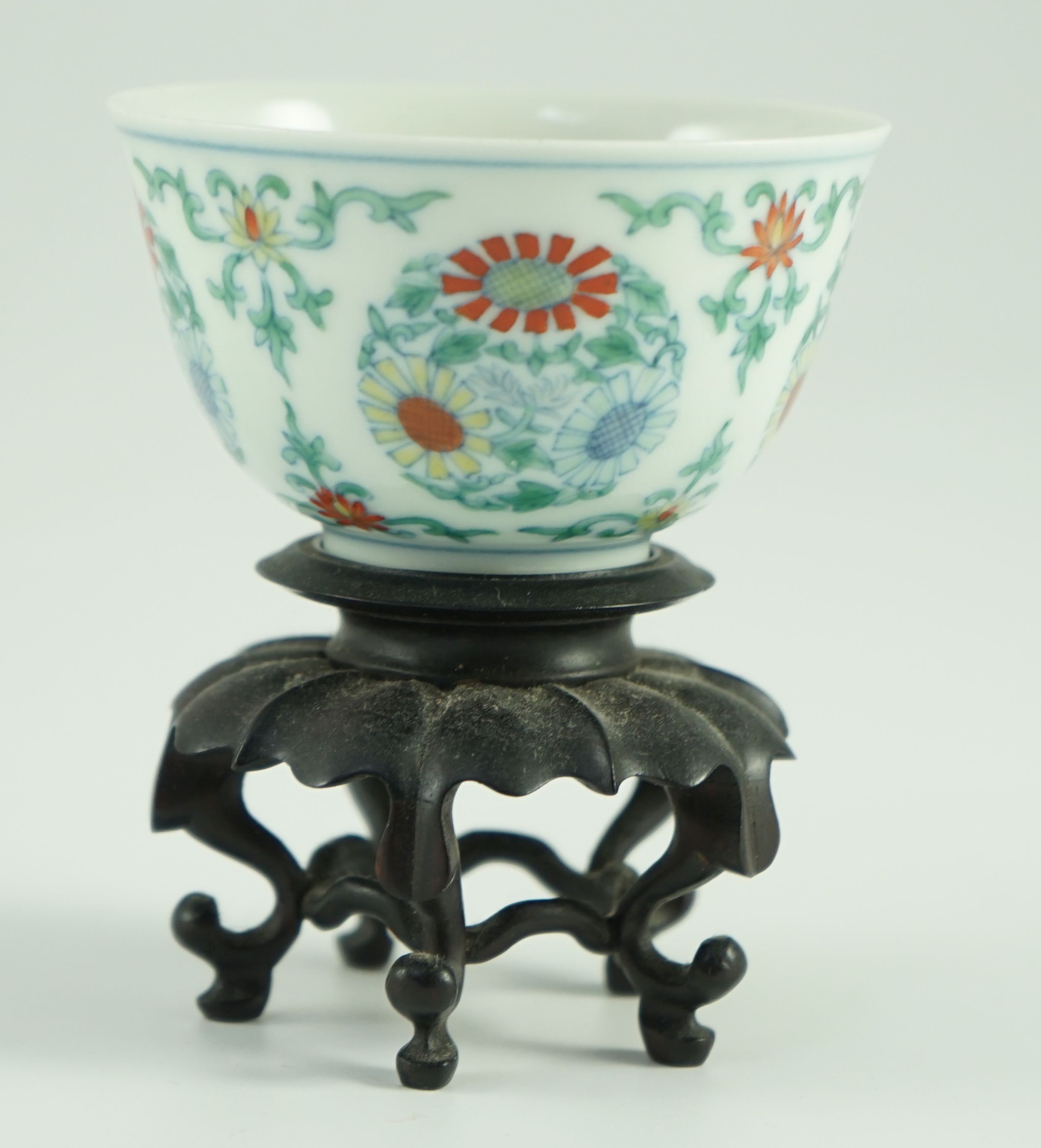 A Chinese doucai ‘chrysanthemum medallion’ cup, Yongzheng mark, probably late 19th/early 20th century, 7.2cm diameter, wood stand