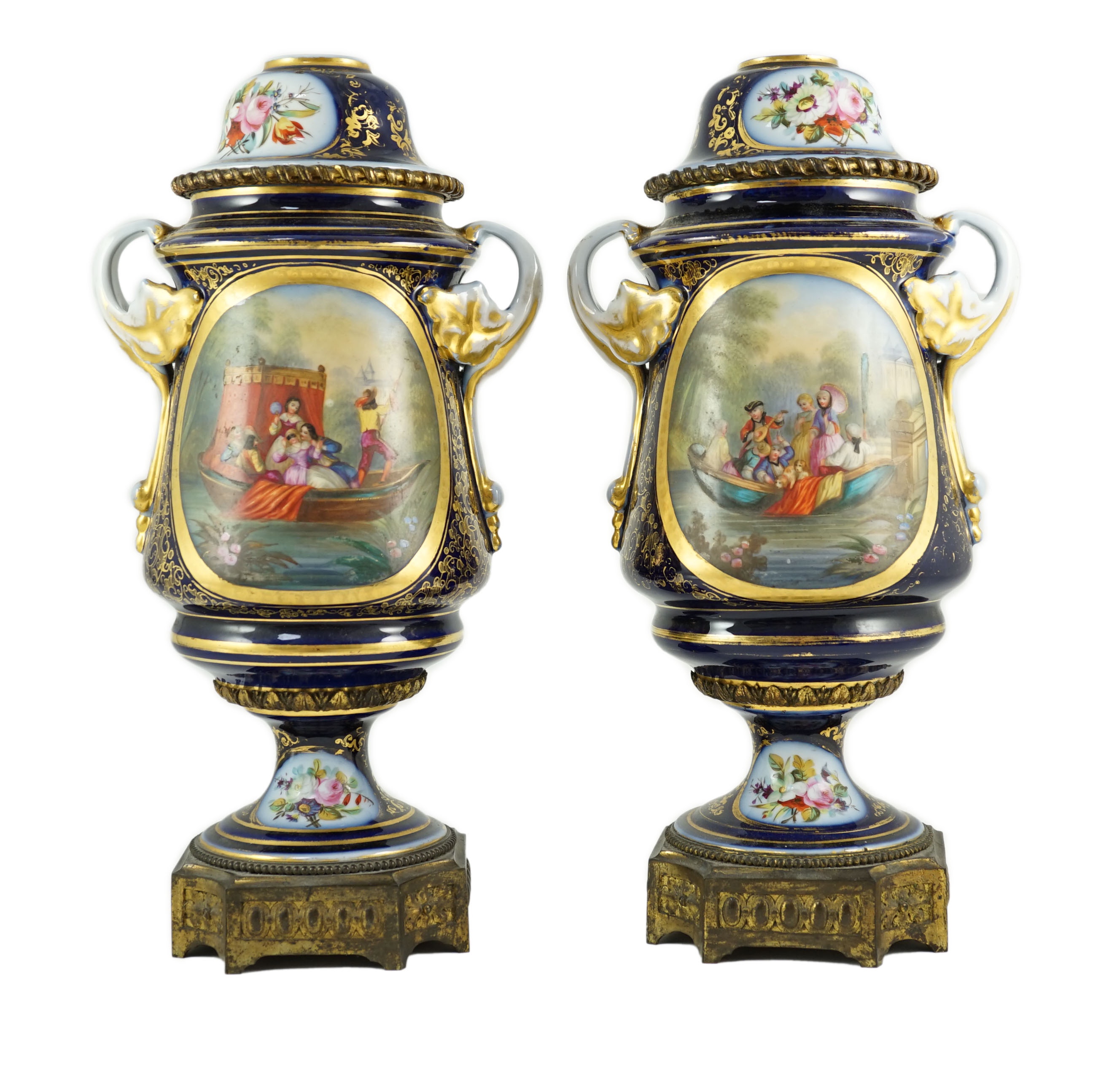 A pair of Sevres style Paris porcelain and ormolu mounted oil lamps, late 19th century, each painted with figures in a boat, the reverse with a floral bouquet, within gilt decorated cobalt blue borders, 43 cm high