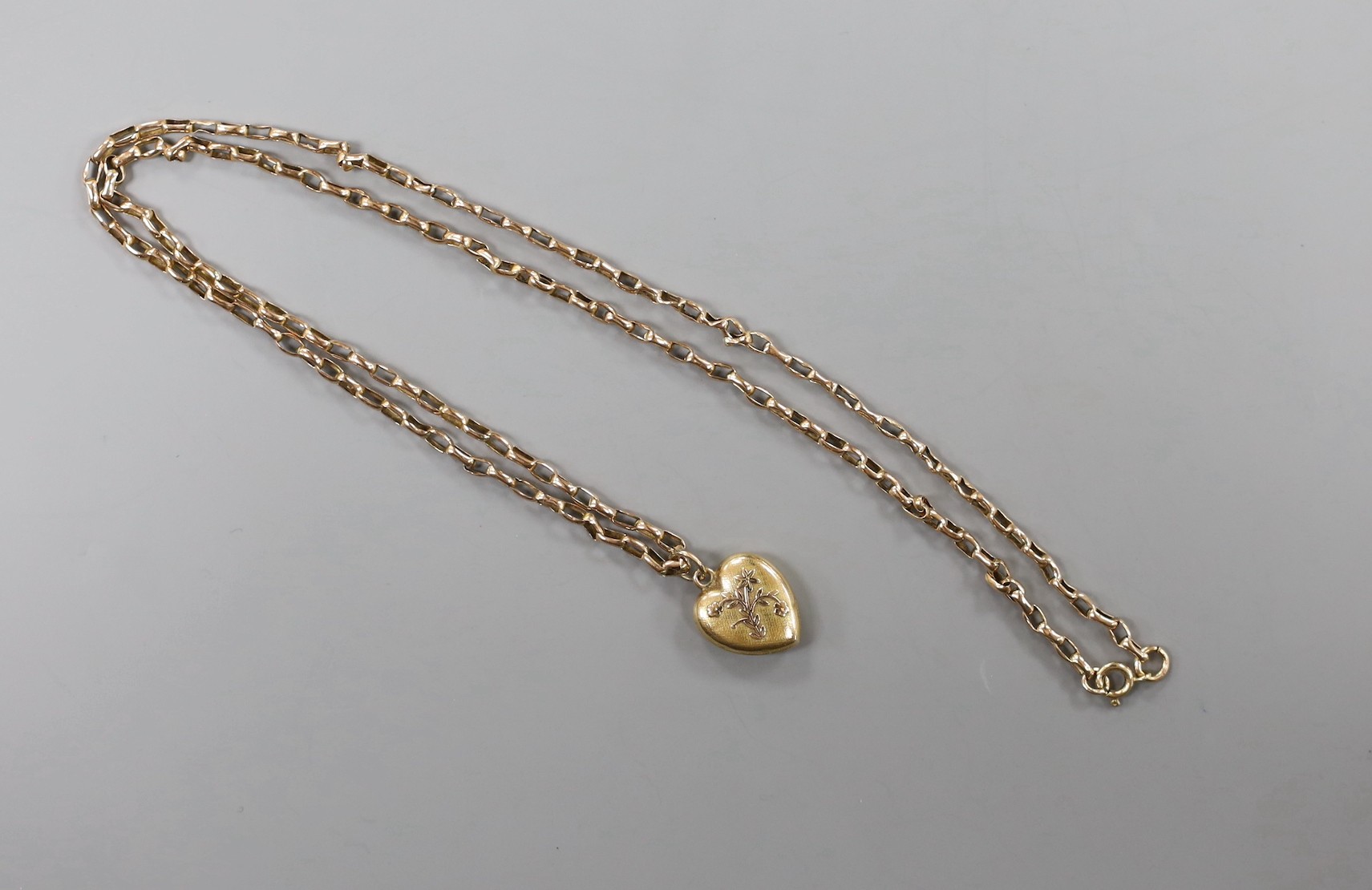 A yellow metal curb link necklace, 51cm, with a 15ct gold heart shaped charm, gross 5.6 grams