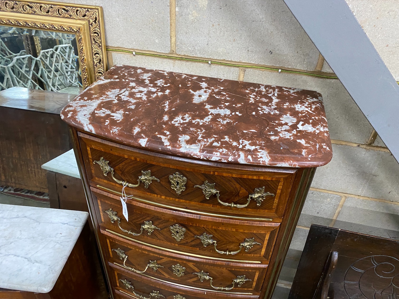 An early 20th century Louis XV style banded kingwood gilt metal mounted marble topped six drawer commode, width 70cm, depth 41cm, height 134cm