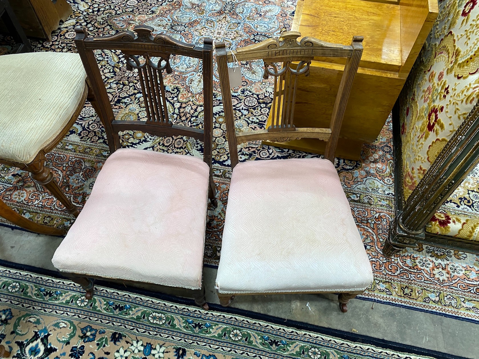A pair of Victorian carved walnut balloon back dining chairs and a pair of late Victorian nursing chairs