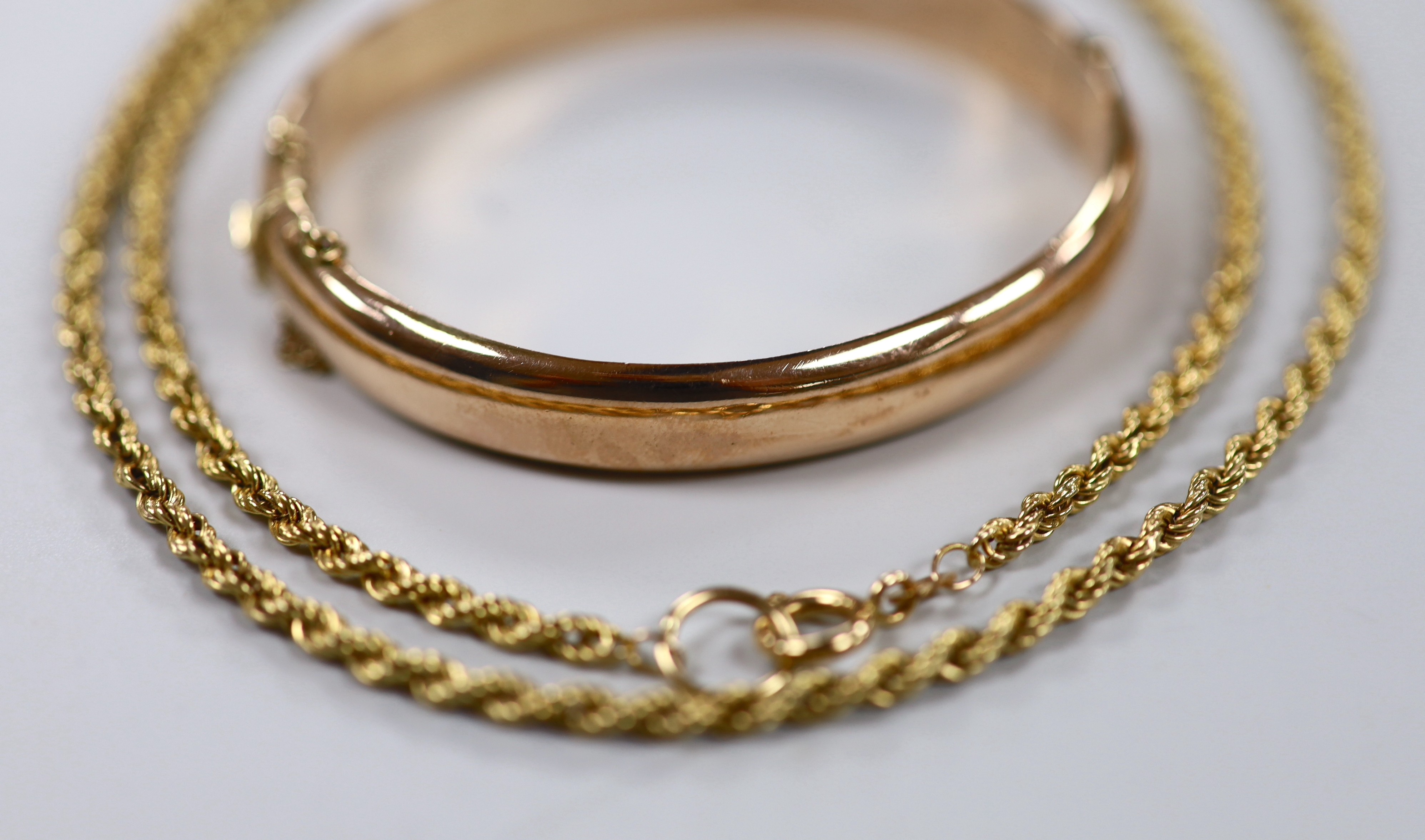 A modern 9ct gold ropetwist chain, 52cm and a 9ct gold hinged bangle, 19.7 grams.