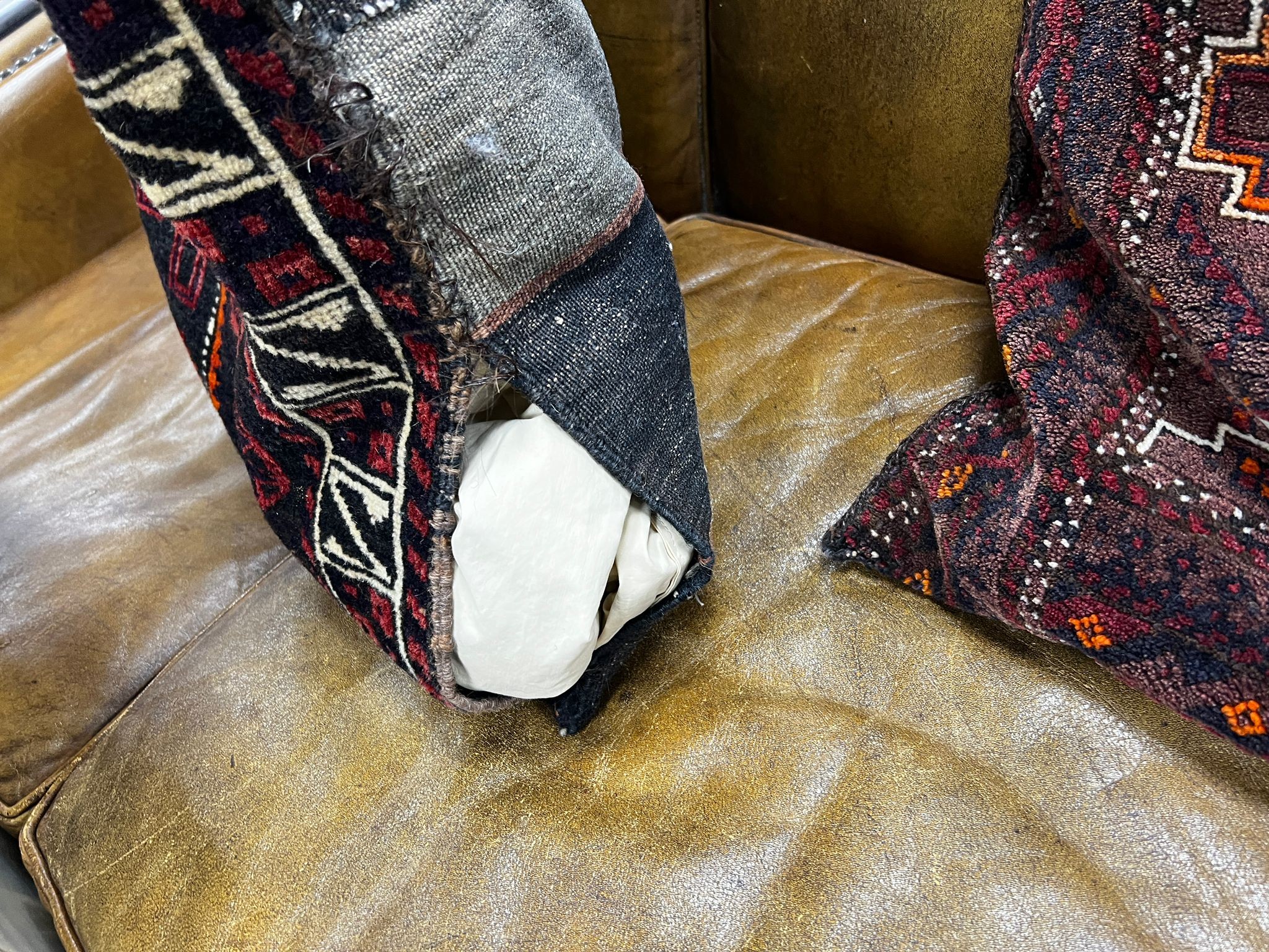 Lot 226 , Two cushions made from saddle bags larger 80cm x 60cm and a blue and gold embroidered table runner