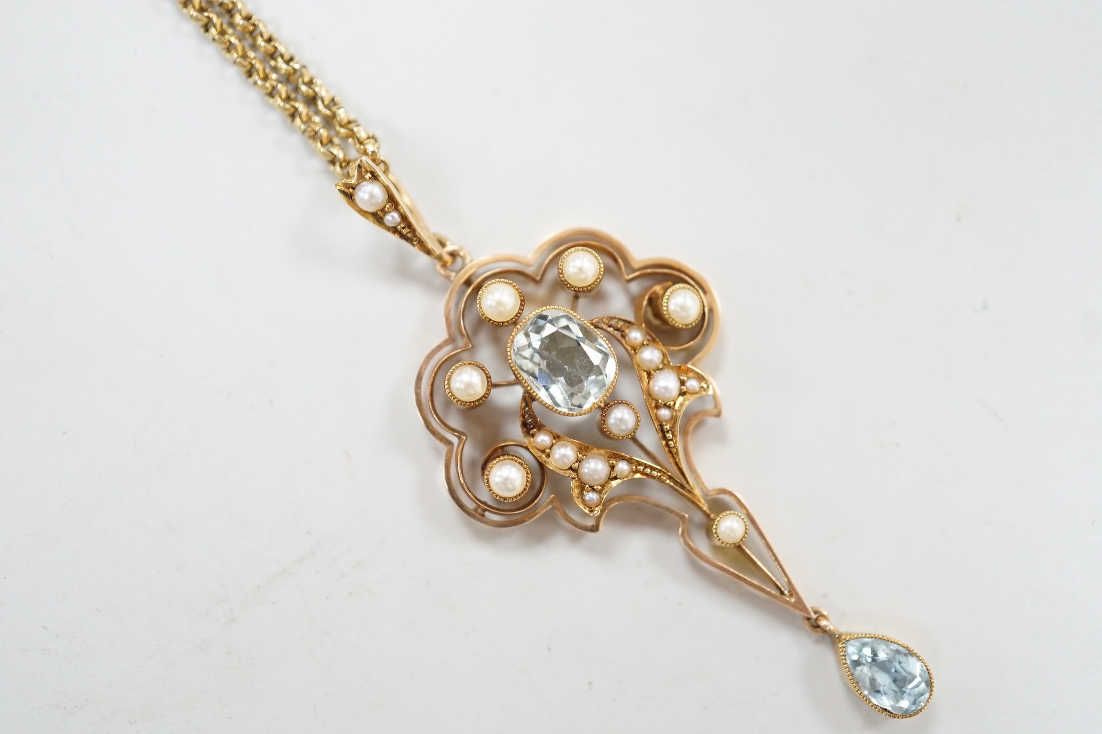 An Edwardian 15ct, aquamarine and seed pearl set drop pendant, 56mm, gross weight 5.3 grams, on a gilt metal chain.